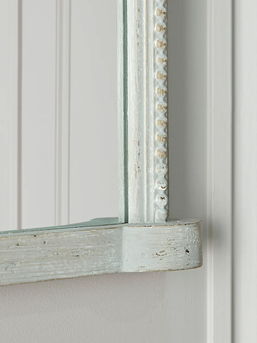 The Rococo inspired styling of our wooden framed Glenside Mirror with its acanthus leaf decoration will bring a romantic faded elegance to any home. With a gently aged painted finish, this classic over mantle mirror will look equally stylish contrasting with a modern console or placed above a chest of drawers in a pretty bedroom.