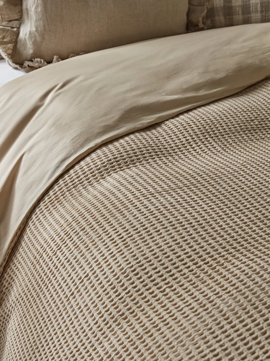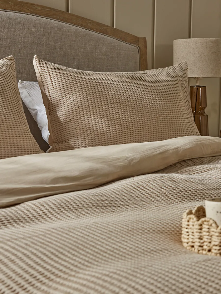 Soft oatmeal tones melt into a delicate waffle texture to create this super king size duvet set.