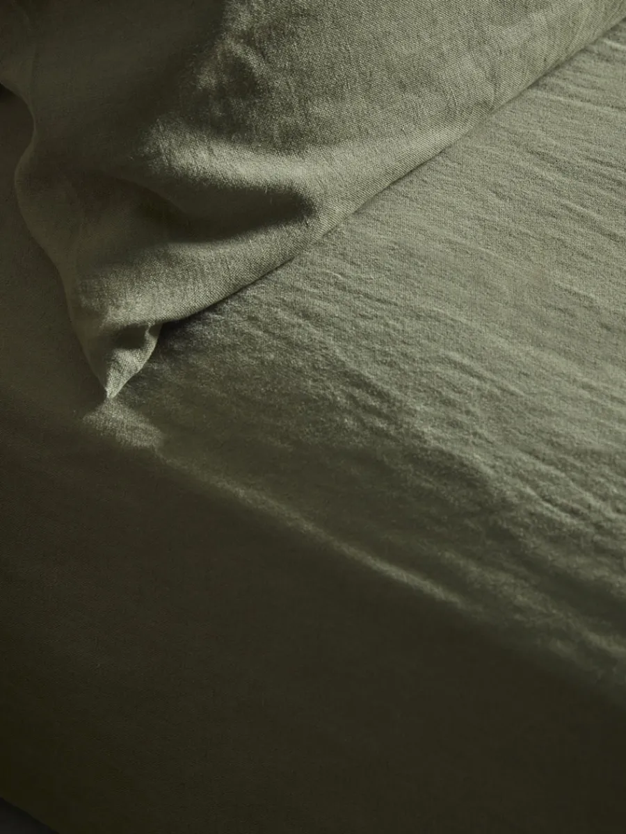 In a warm and comforting olive green, our supersoft fitted sheet is made from a luxurious blend of linen and cotton, perfect for warmer nights.