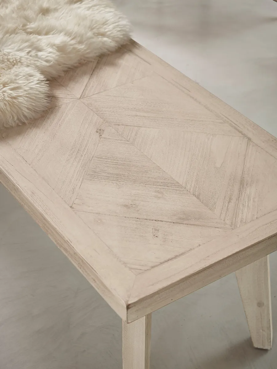 A lovely celebration of the natural beauty of wood, our Limewashed Parquet Bench has a simple outline which focuses all the attention on the texture of the chevron patterned top.