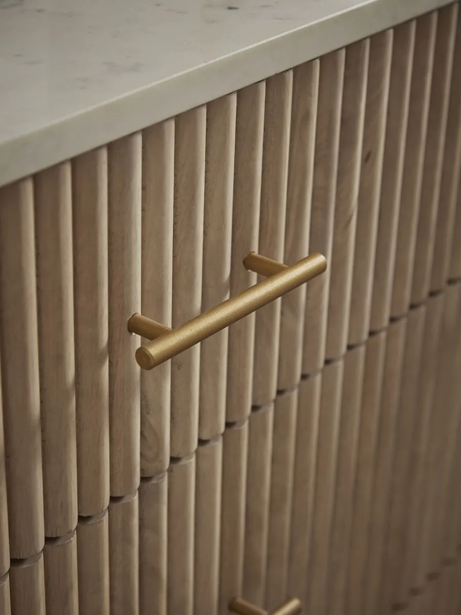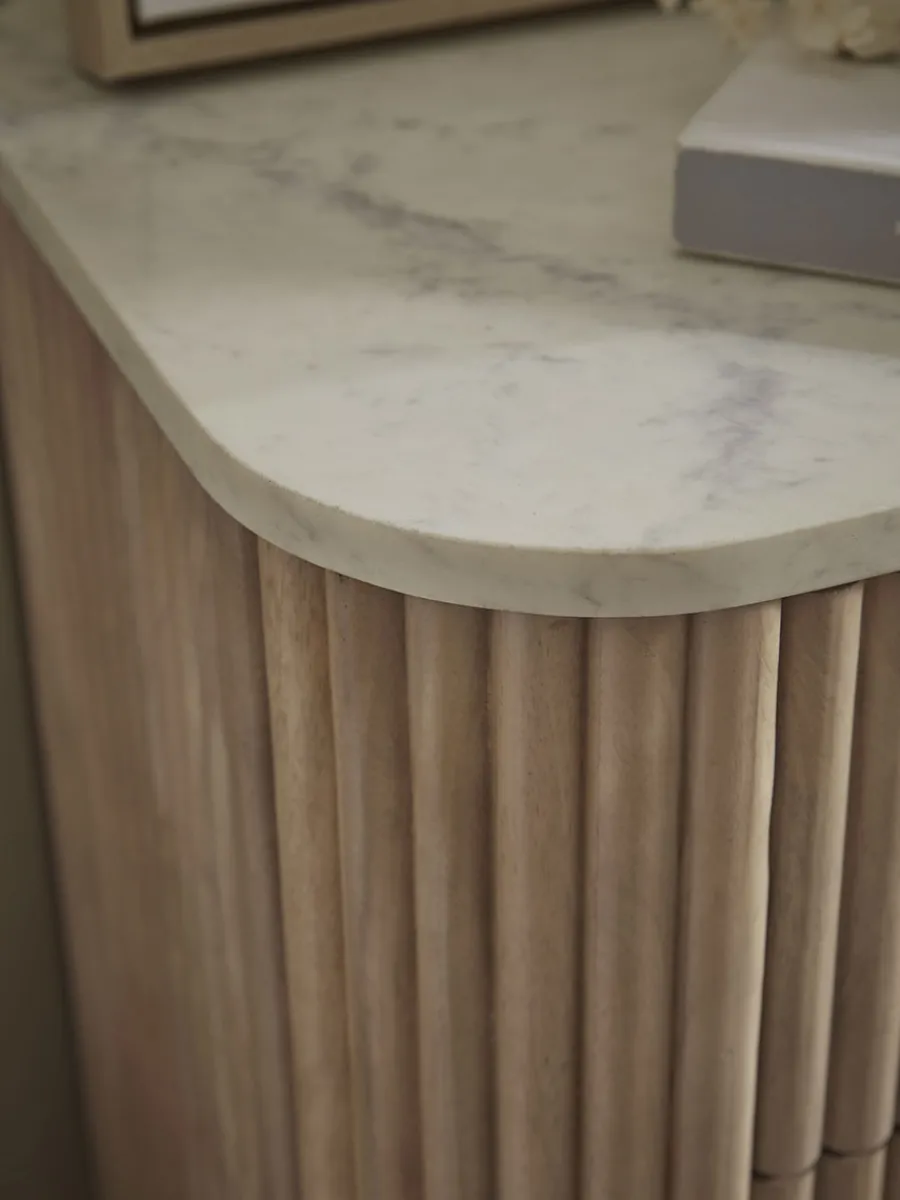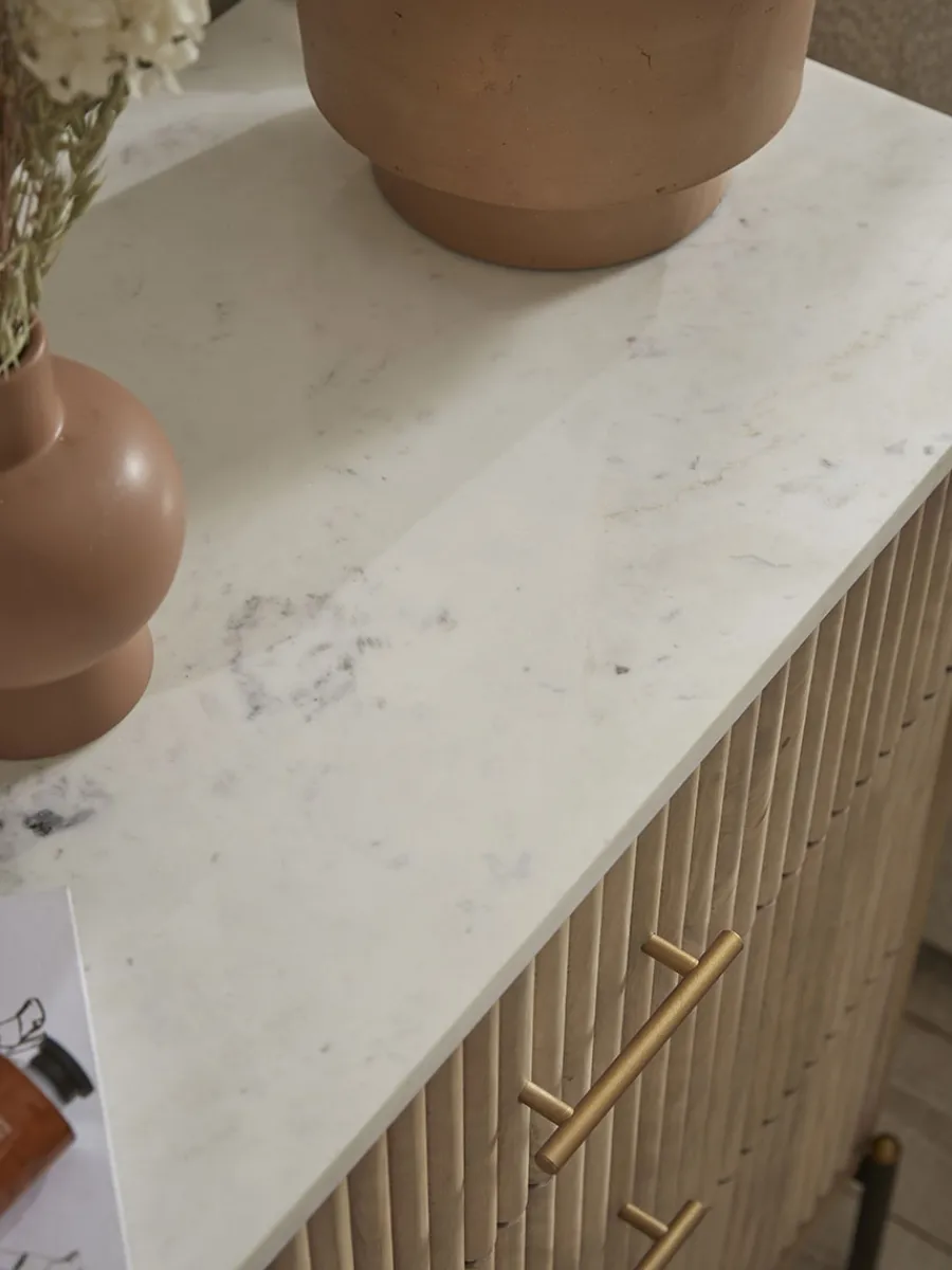 The smooth and cool white marble top of our Freja Chest of Drawers contrasts beautifully with the rich palette of natural tones seen in the reeded wooden body and drawer fronts.