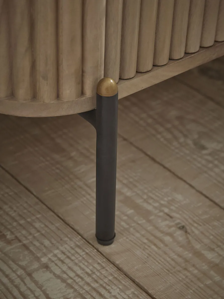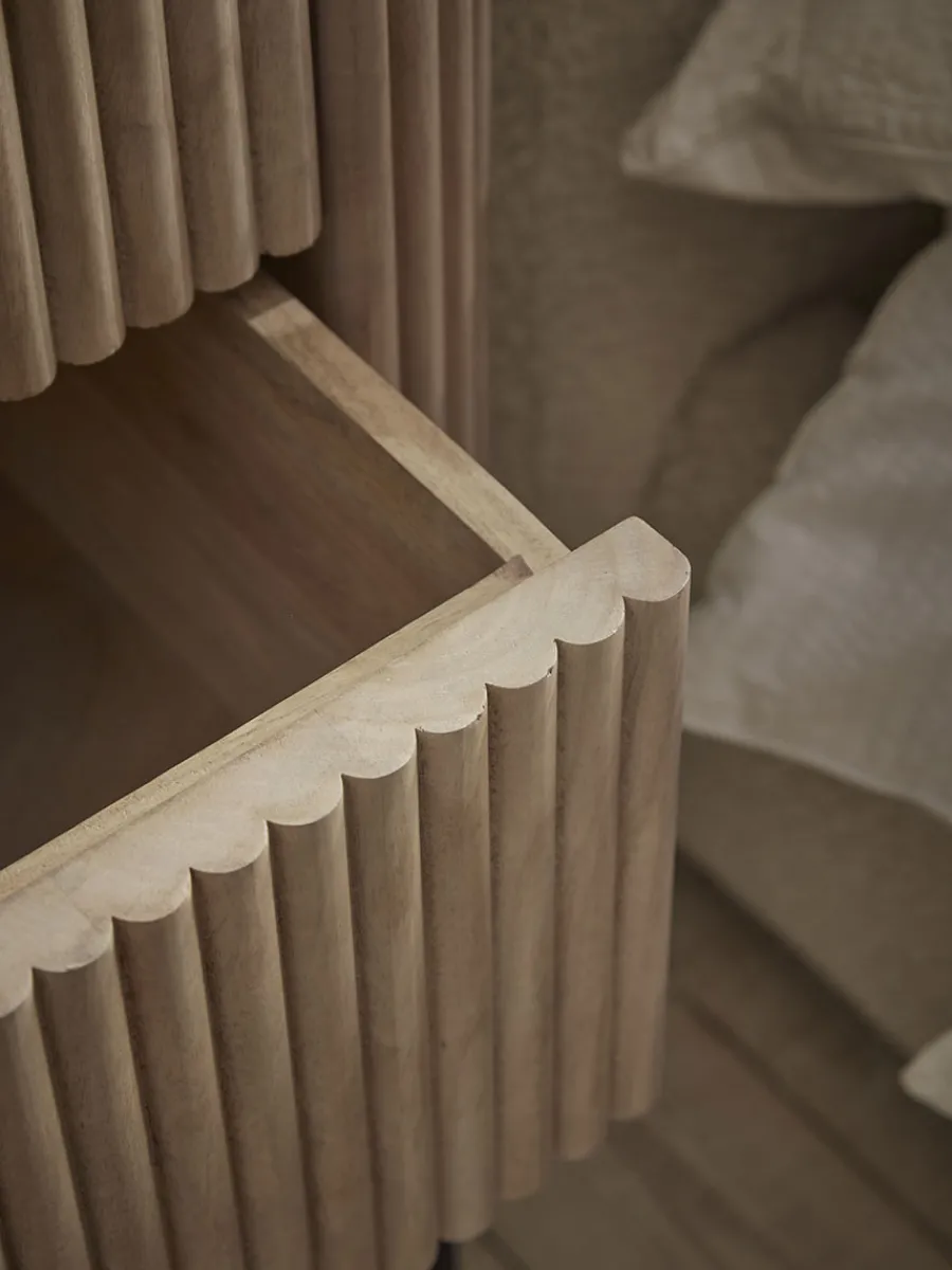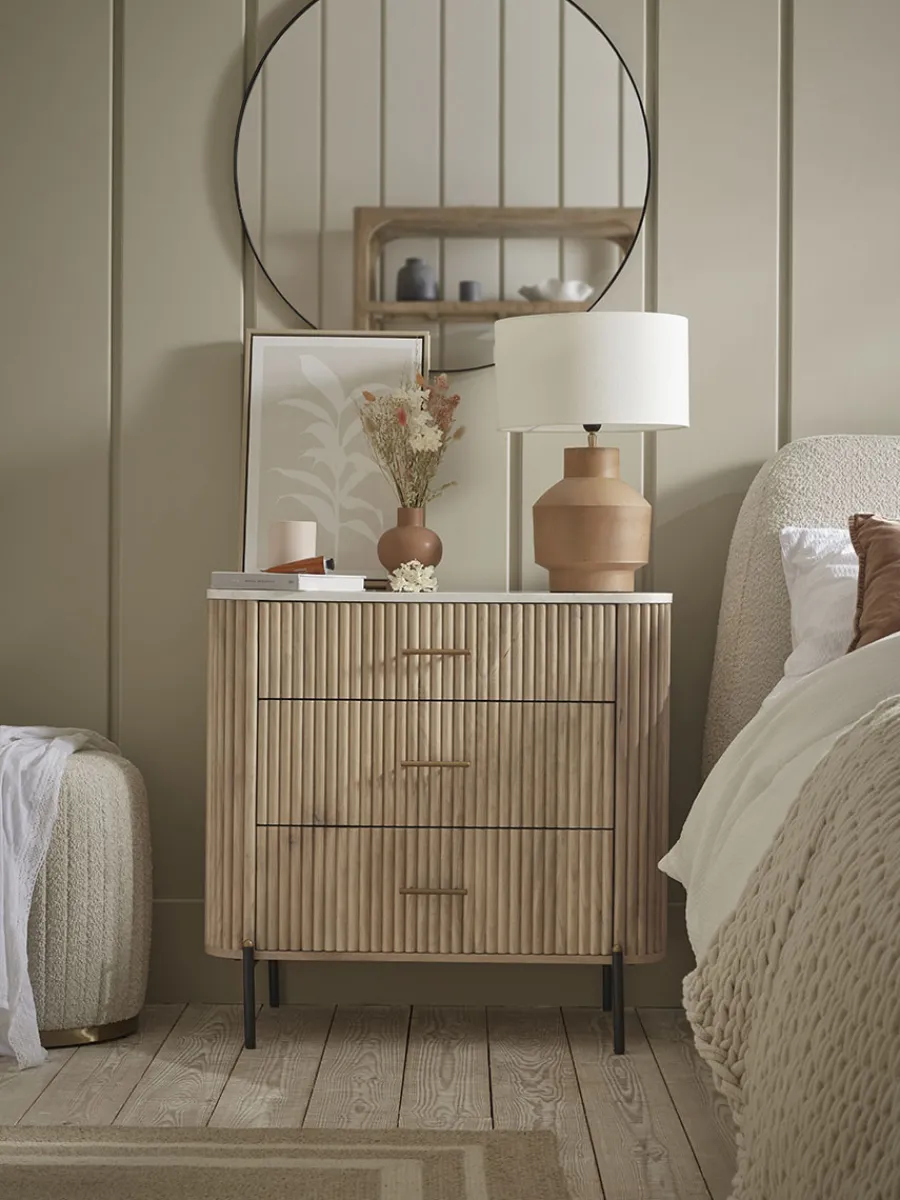 The smooth and cool white marble top of our Freja Chest of Drawers contrasts beautifully with the rich palette of natural tones seen in the reeded wooden body and drawer fronts.