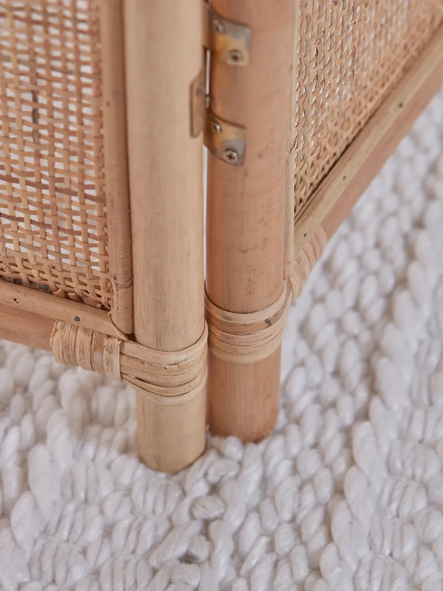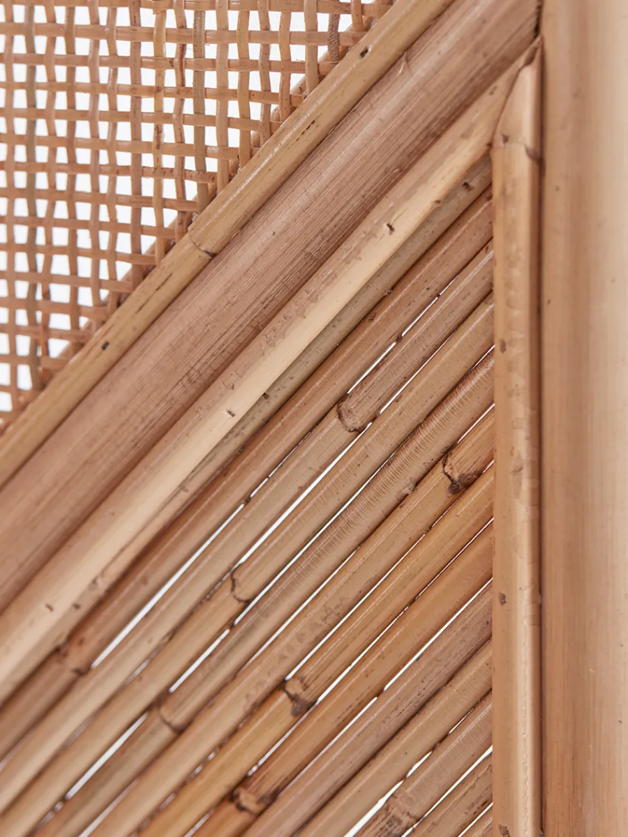 Our Eva screen provides three classic hinged panels with bentwood frames filled with rattan. Canework inserts, plain on the outer panels and arranged to create a chevron design at the centre, provide additional interest.