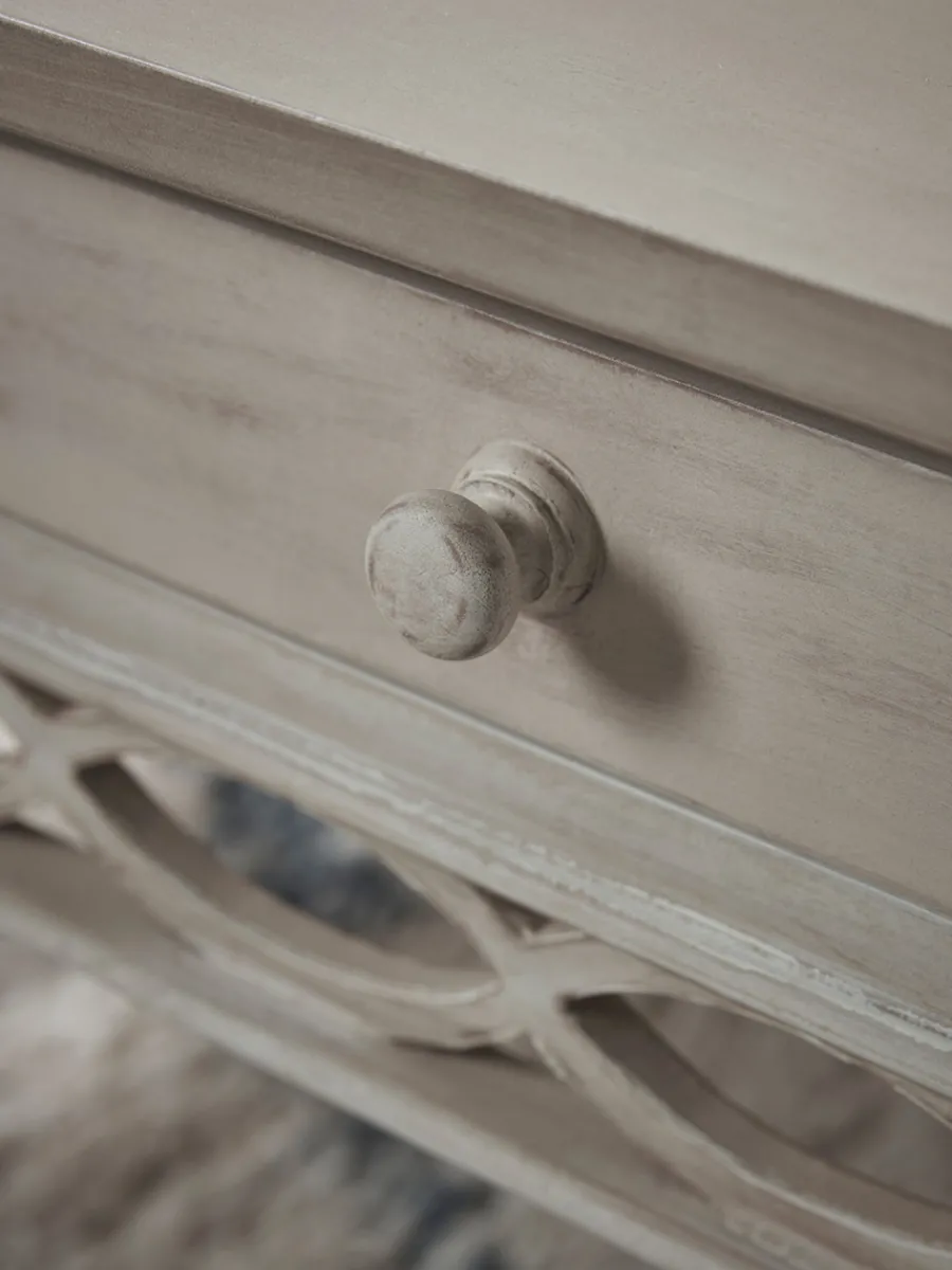 Crafted from melia wood and mahogany, this charming piece has a delicate carved trellis edge which, combined with gently tapering legs, adds to its elegance. A slender drawer completes the design.