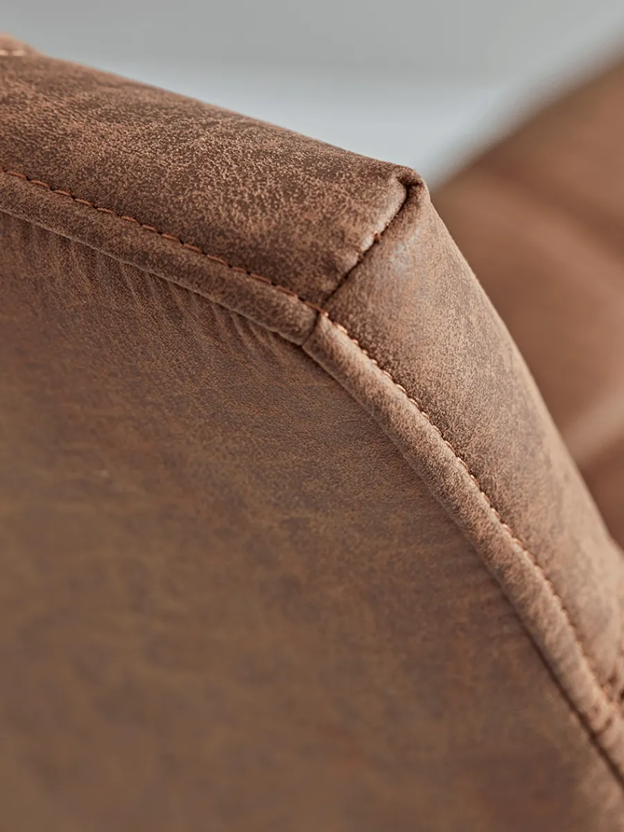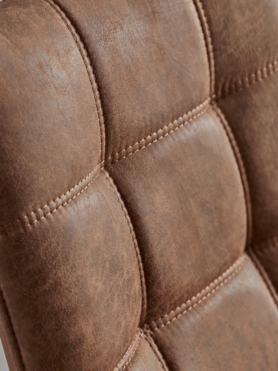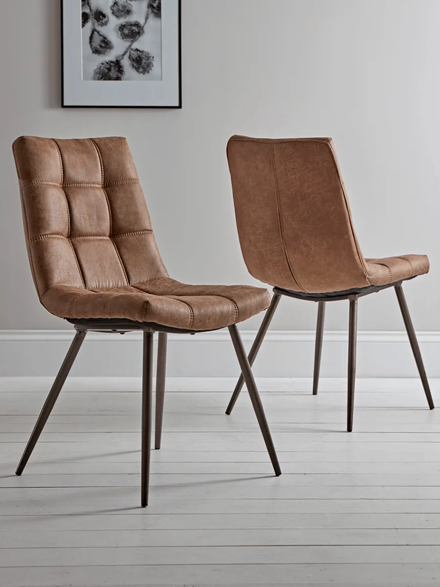 With a sleek, simple silhouette and a comfortable seat upholstered in faux leather, our set of two factory style dining chairs in tan will make an edgy addition to your kitchen décor.