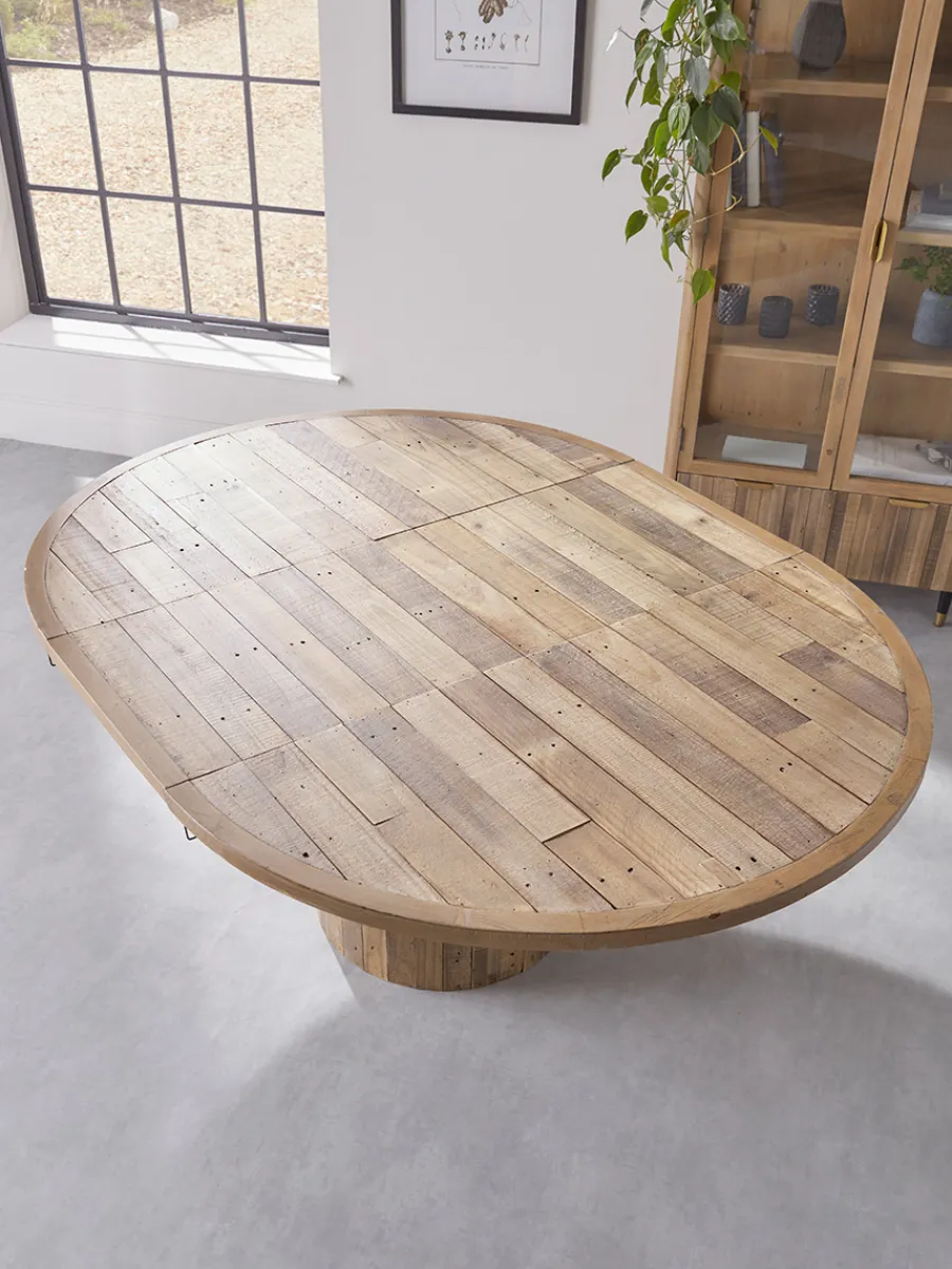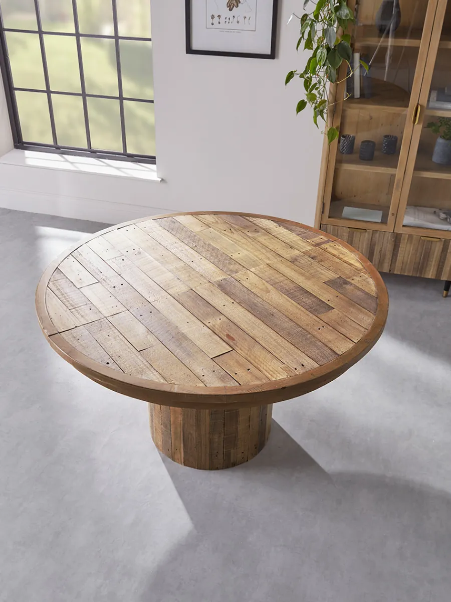 A good choice for smaller spaces, our Astoria round table is extendable and features a cylindrical base and a deep boarded top to add a charming warmth to your dining room or kitchen.