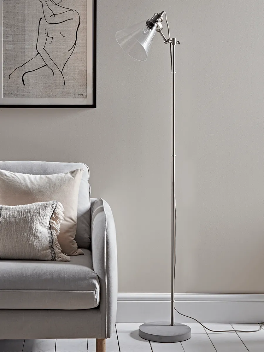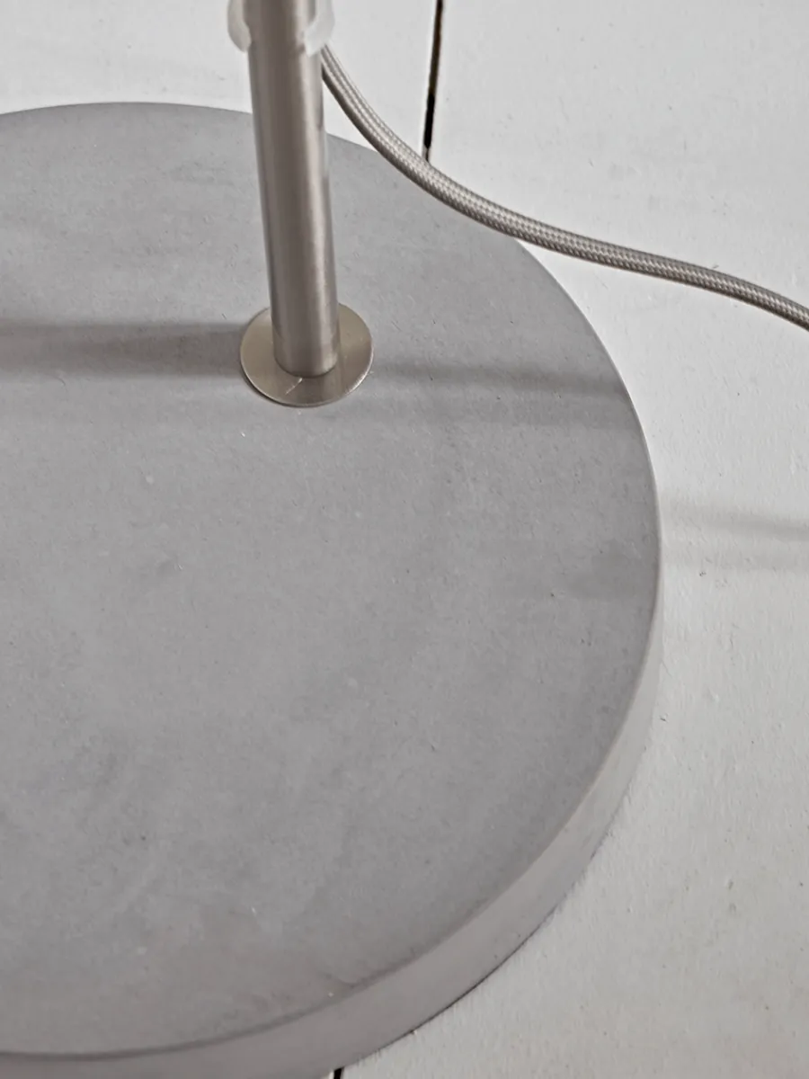 Made from weighty steel with a curved neck, our sleek floor lamp includes a sturdy round concrete base and glass cone shaped shade.