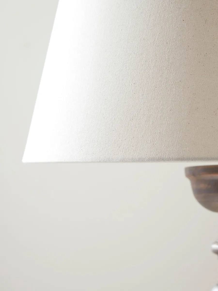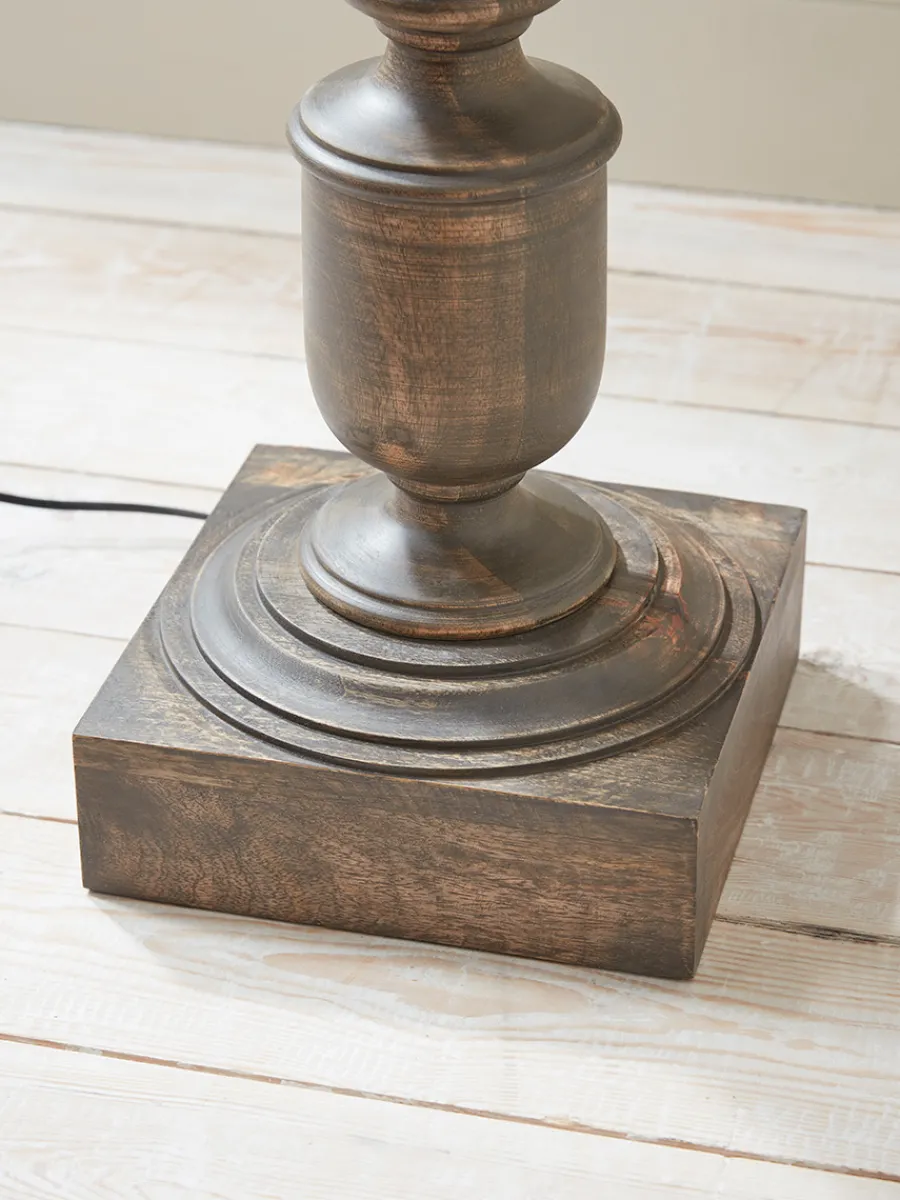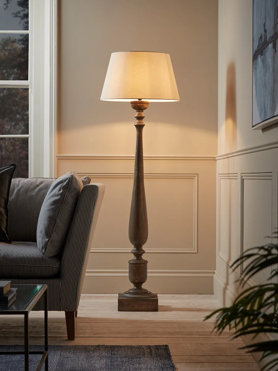 A beautifully turned wooden base gives this floor lamp its classic styling, creating an elegant undulating silhouette, perfectly balanced by the gently tapered calico shade.
