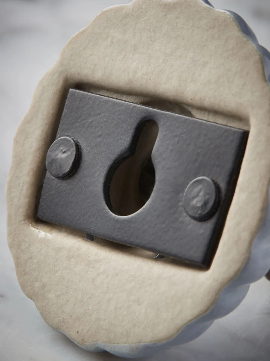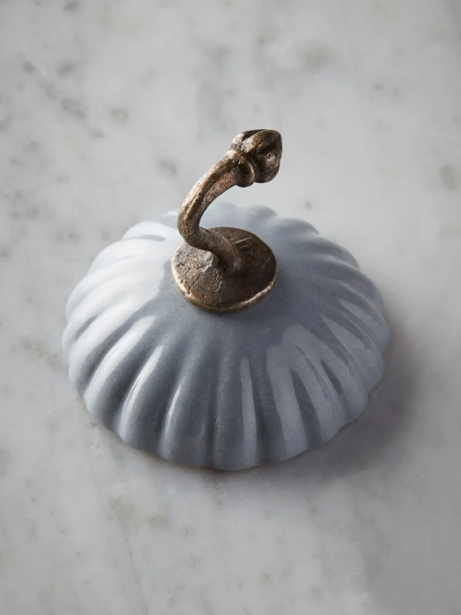 A delicately detailed scalloped piece, this single hook is crafted in a grey blue colour, pairing beautifully with its brass coloured hook for a vintage feel. Perfect for hanging smaller towels in your bathroom, or to hang tea towels on in your kitchen.