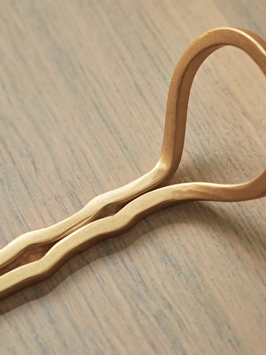 A pair of elegant golden coat pegs with spoon-shaped loops forming the top hook and a narrower lower hook at the bottom.