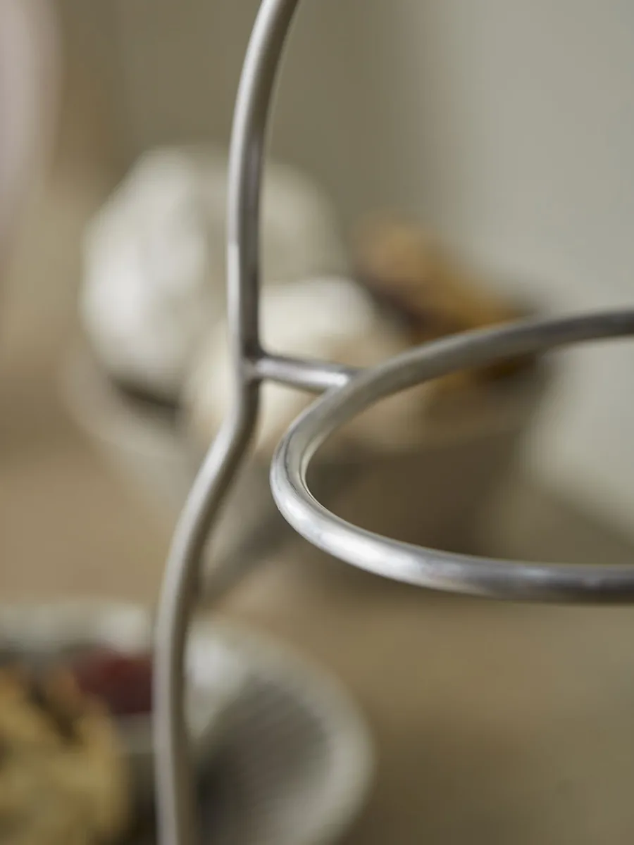 Three tiered cake stand made from stainless steel.
