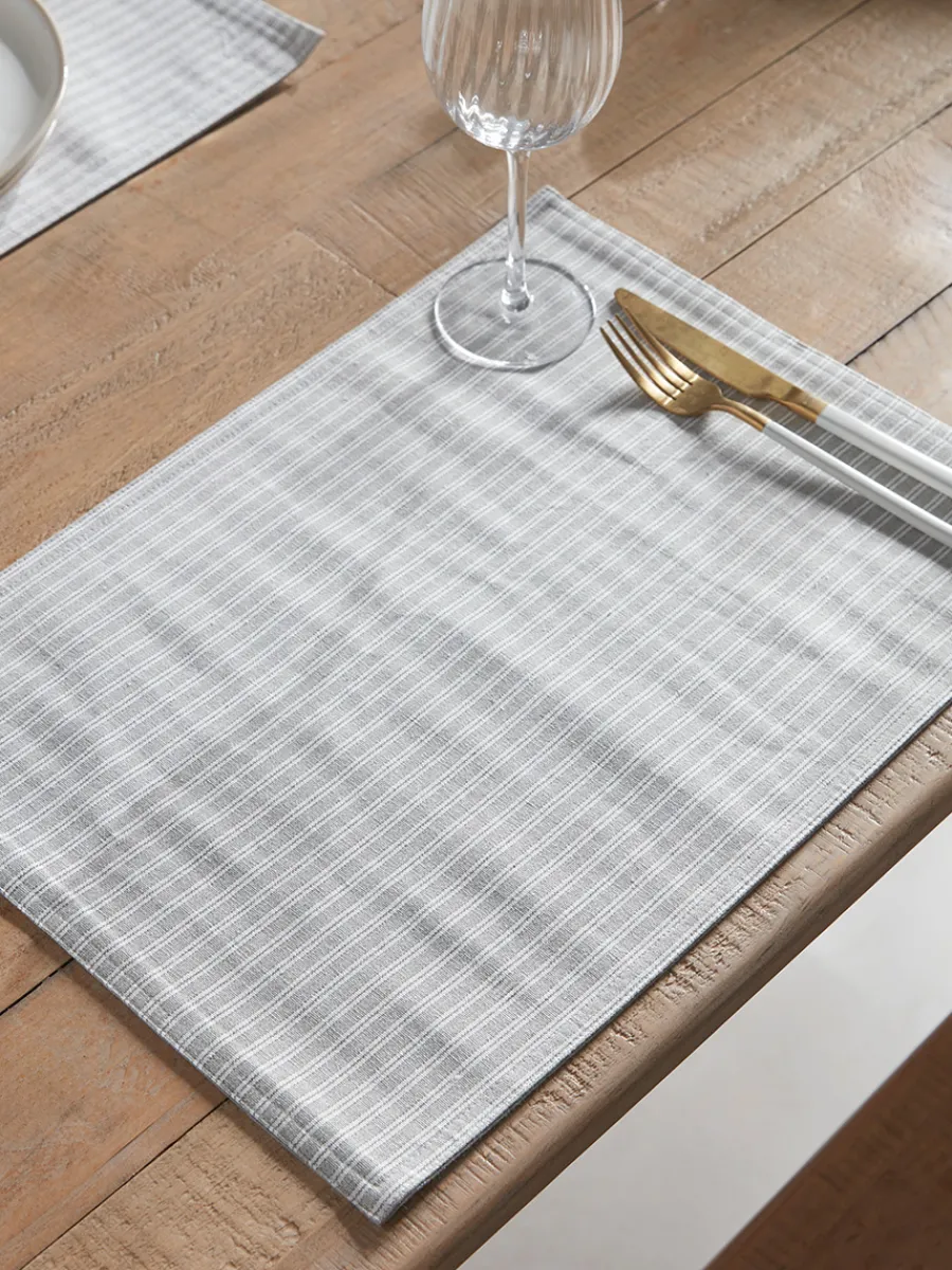 With the timeless design of dainty stripes complementing the simple block colour, these placements have a simplicity to them inspiring a peaceful and calming atmosphere around your dining table.