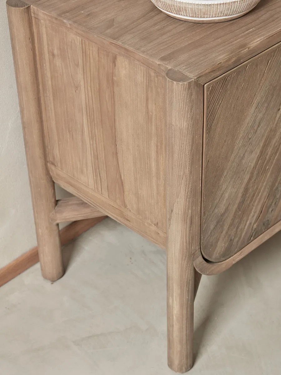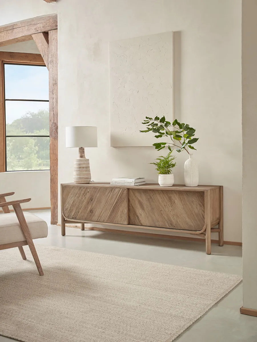 With a tubular wooden frame and softly rounded corners, this versatile piece will add character to a neutral scheme. Sliding doors make it a good choice for smaller rooms and ample storage space is available for hiding games consoles and other media equipment.