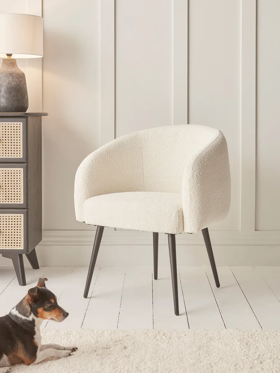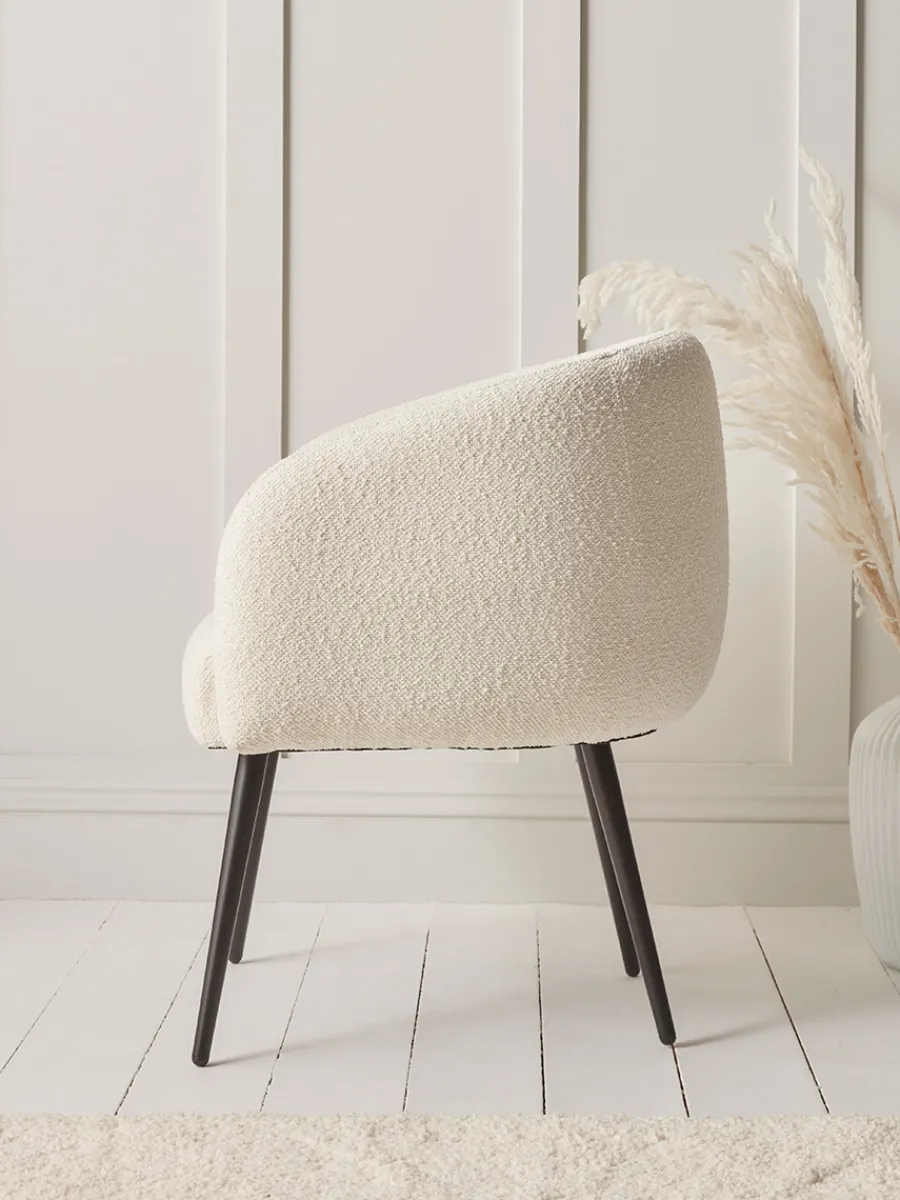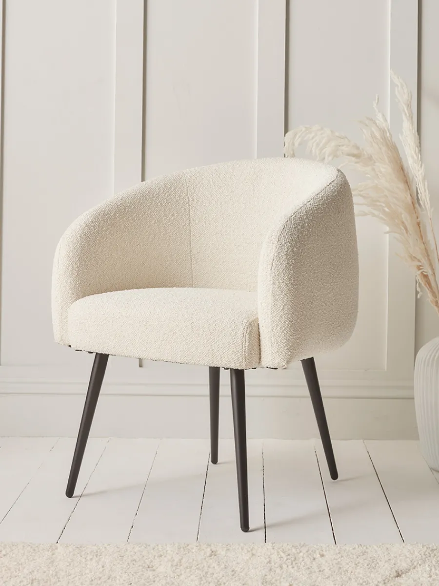 Upholstered in teddy bear soft bouclé fabric in cream, this tub chair is a cosy addition to our occasional chair collection this season.
