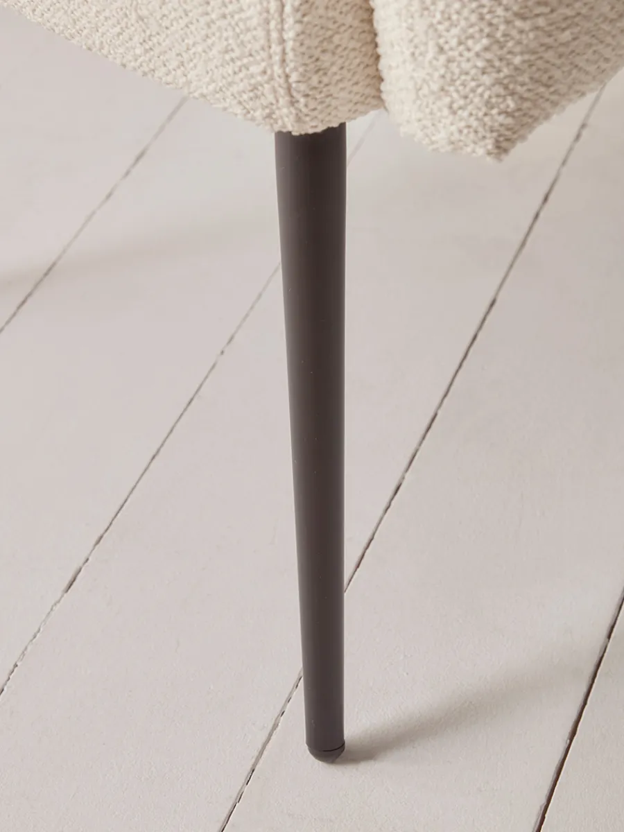 Chair with maple wood frame upholstered in polyester bouclé with foam and polyester fill, on metal legs