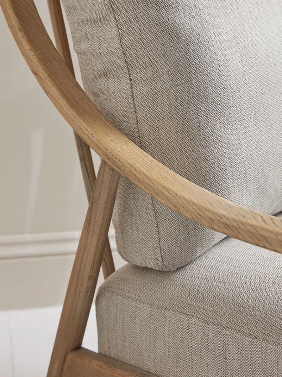 A reassuringly high spindle backed frame gives way to swooping curved arms and deep welcoming linen back and seat cushions.