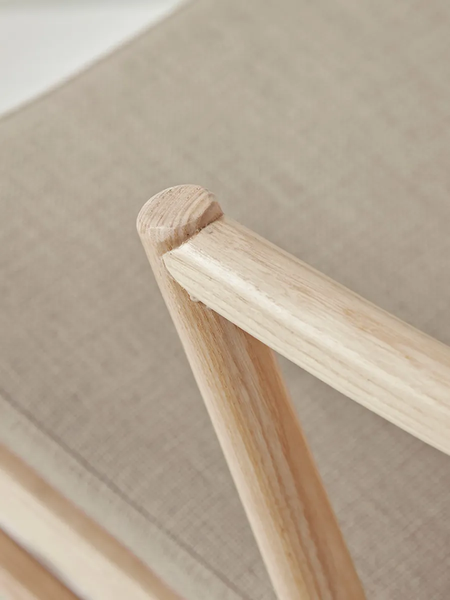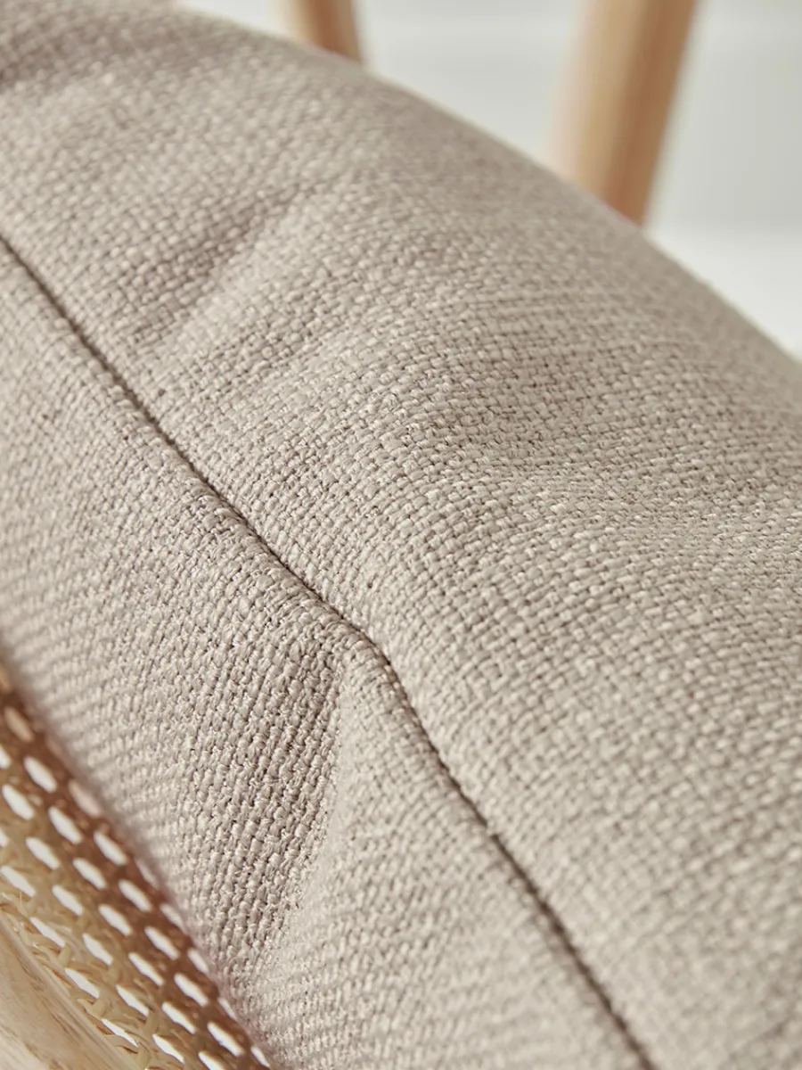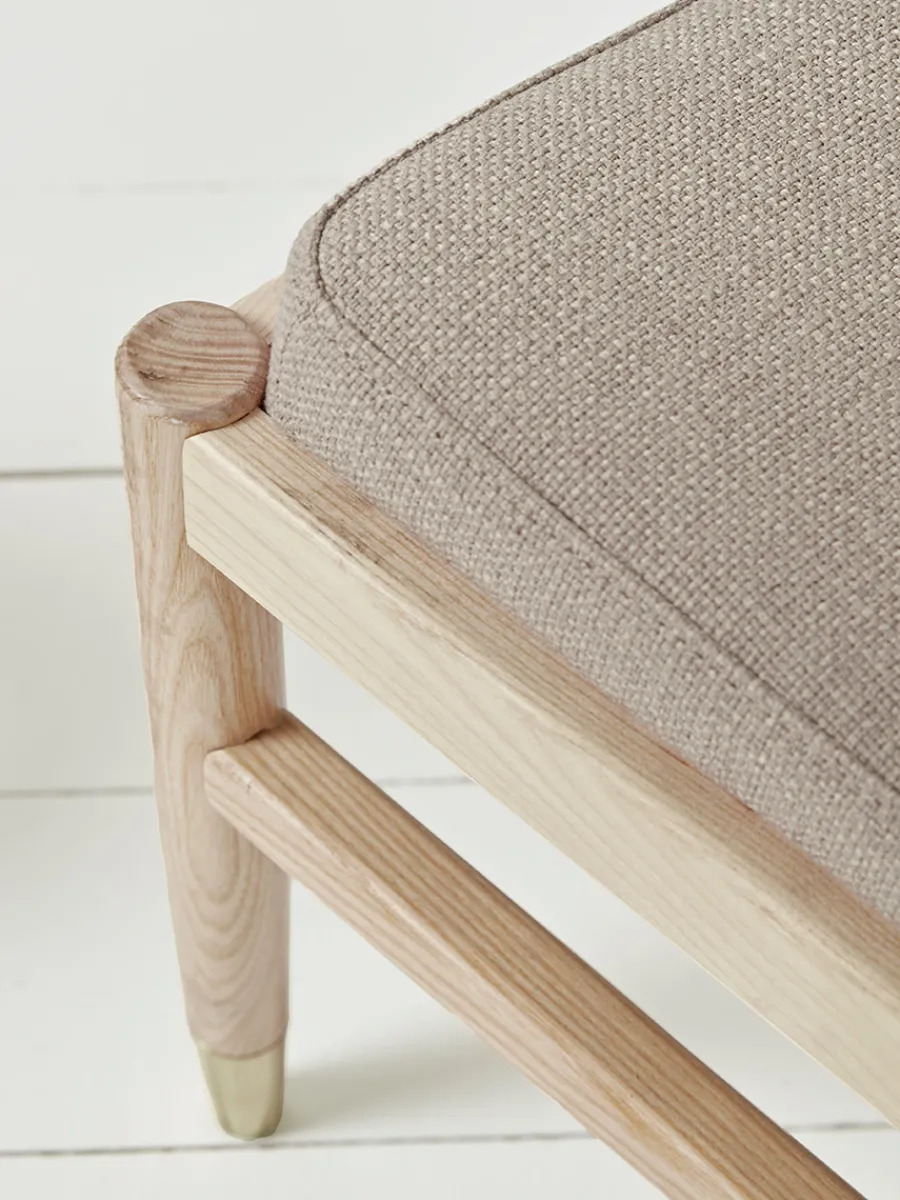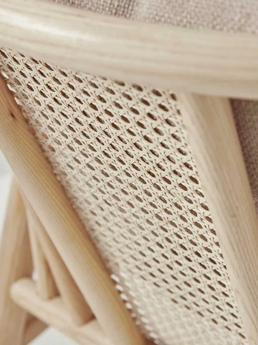 The curvaceous ash frame and spindle back and legs echo mid-century bentwood styles given a modern flourish, with feet neatly capped in brass. The back features a pretty rattan panel and comfort is guaranteed, thanks to a plump seat cushion in a warm toned complementary linen.