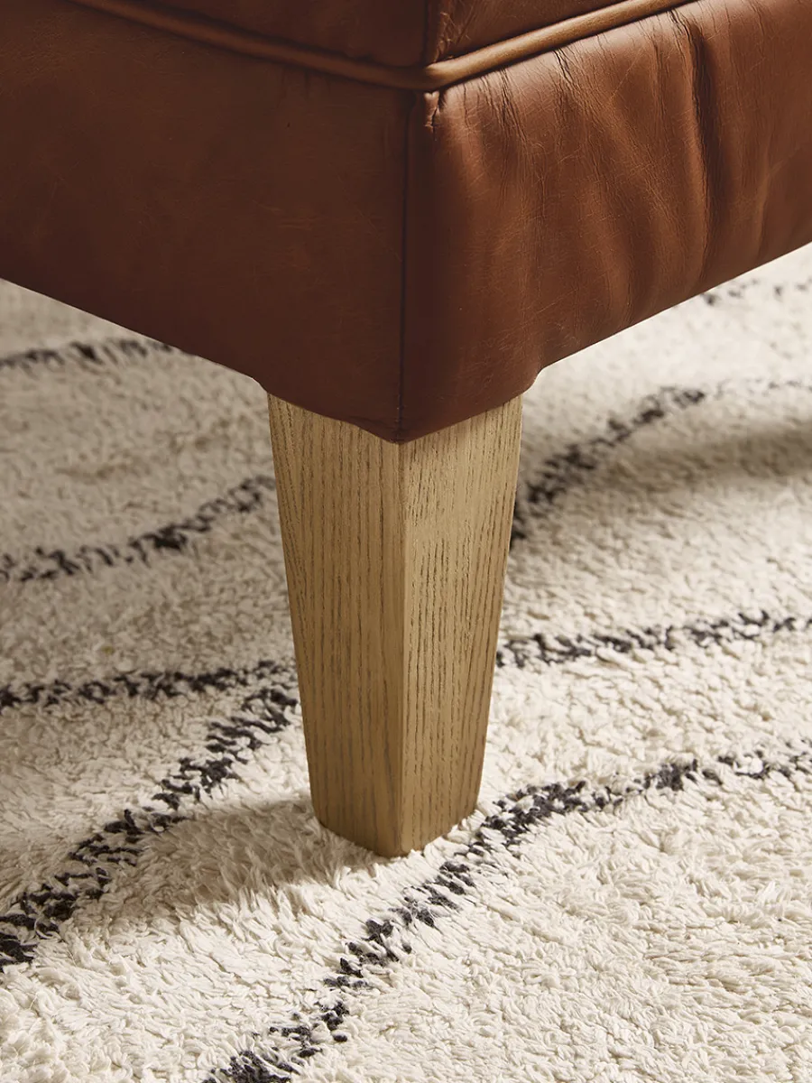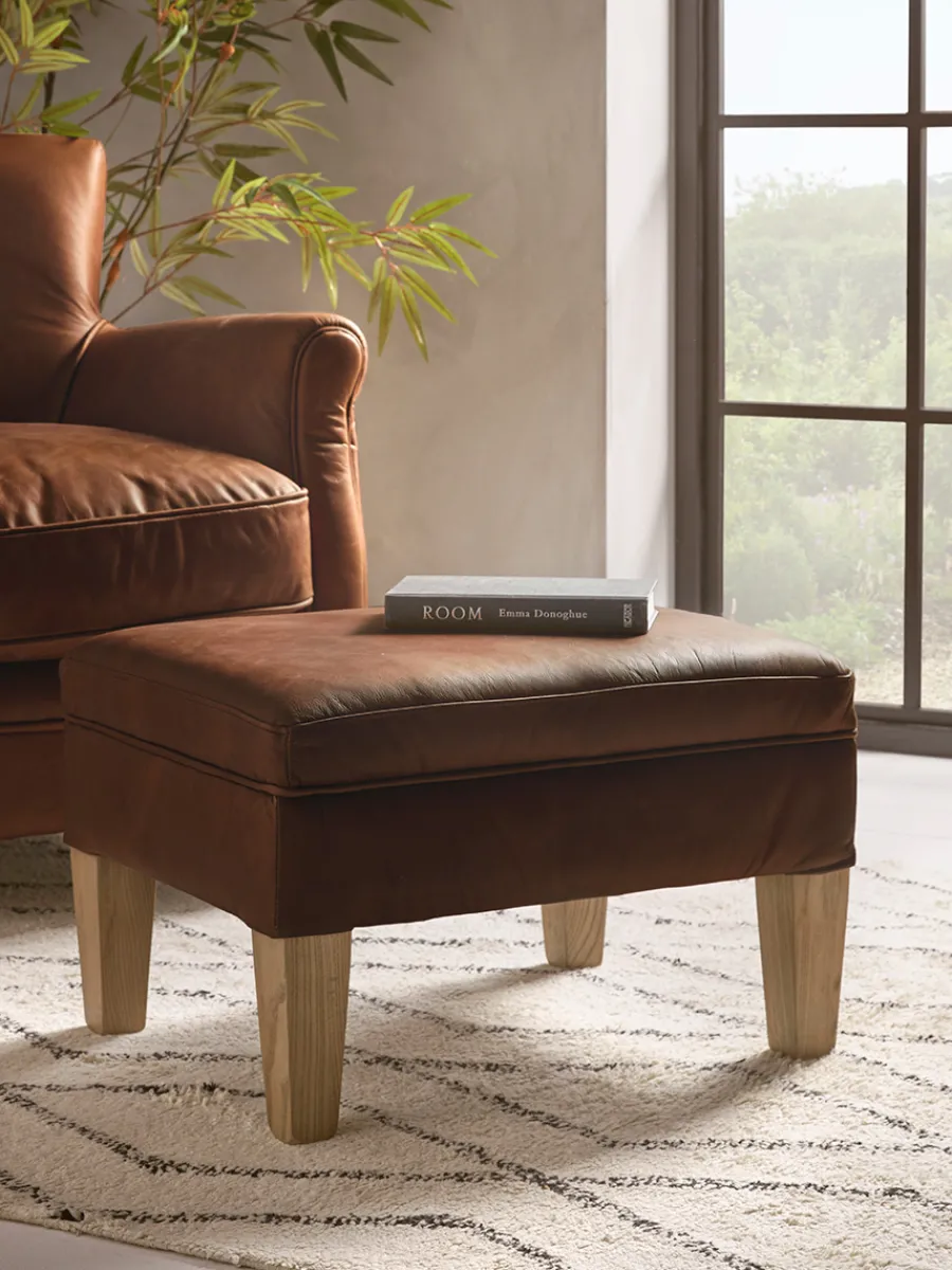 Upholstered in the same rich chestnut leather as our Hardwick armchair and sofa, the Hardwick Leather Stool stands solidly on sturdy oak legs and has an aged and lived in look that will add warmth in any setting.