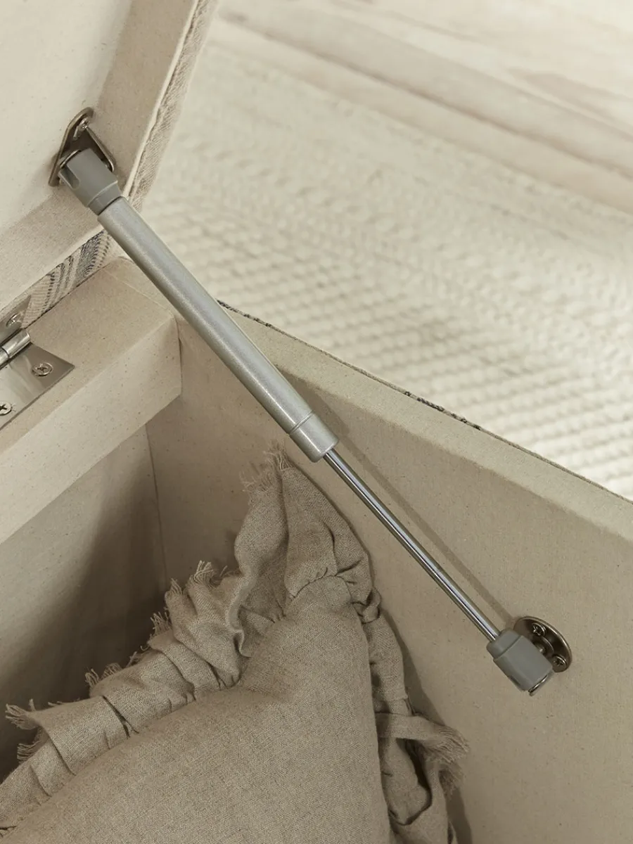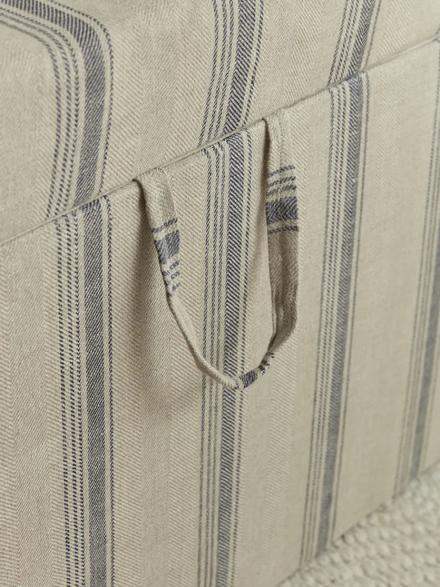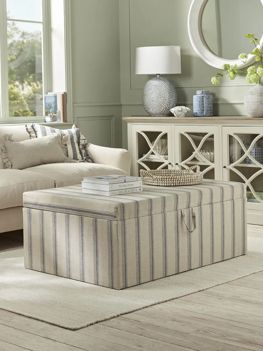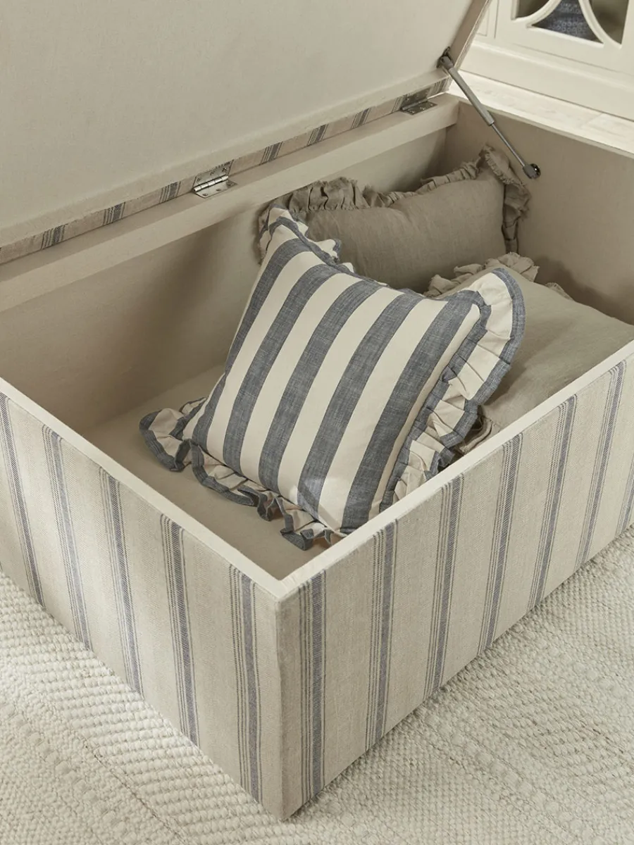 Upholstered in a classic beachy blue and cream stripe, the lid lifts easily with a simple cloth handle to reveal a huge void perfect for storing toys, spare bedding and any other clutter which is detracting from a peaceful ambience.