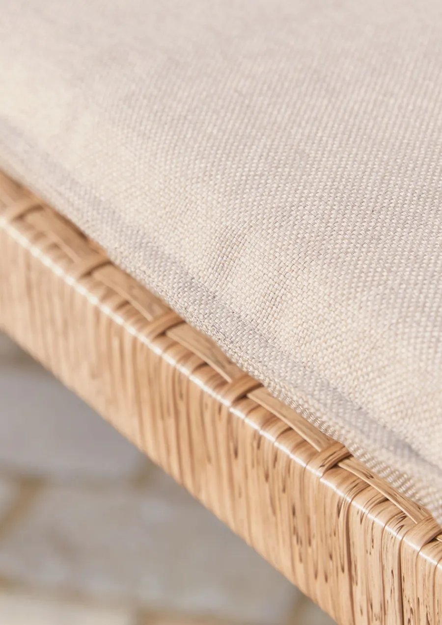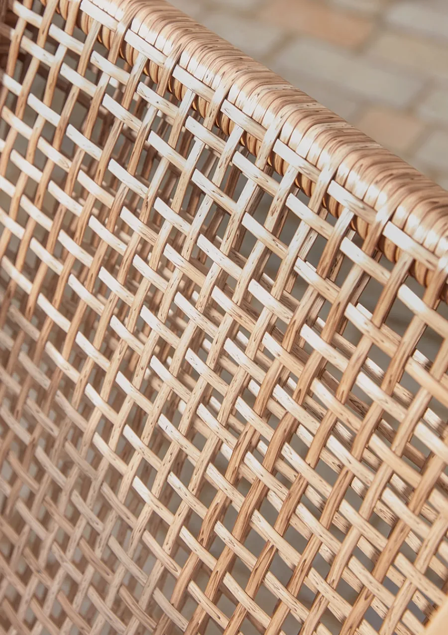 Gently sloping low arms provide an airy spacious chair which is complemented by the neatly woven faux wicker seat and back. A stone coloured seat pad provides additional comfort.