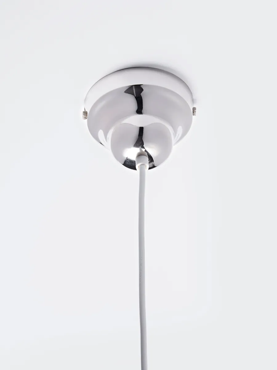 Carefully hand blown glass in a half-oval shaped, our contemporary dome glass pendant features a natural mango wood top, a simple white flex and a domed metal ceiling rose.