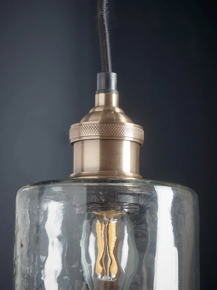 The hammered effect to the shade in this striking pendant adds an aged look to the clear glass which is amplified by the gently antiqued brass of the fixtures.