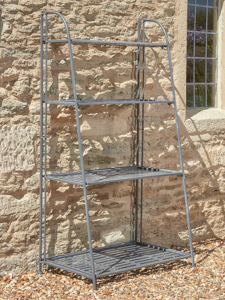 Suitable for use both indoors and out, the stand includes four large slatted shelves and a simple curved frame, all with a slightly distressed finish.