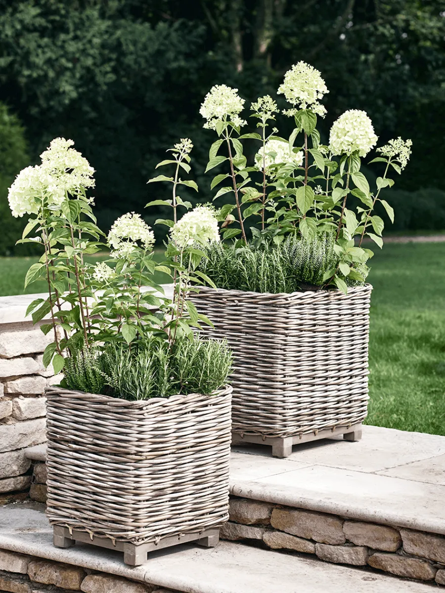 Made from woven rattan with a hidden plastic lining, our set of two different sized square planters offers an attractive alternative to terracotta pots and includes a clever hidden plastic lining. Match with our Rattan Planter for a stylish outdoor display.