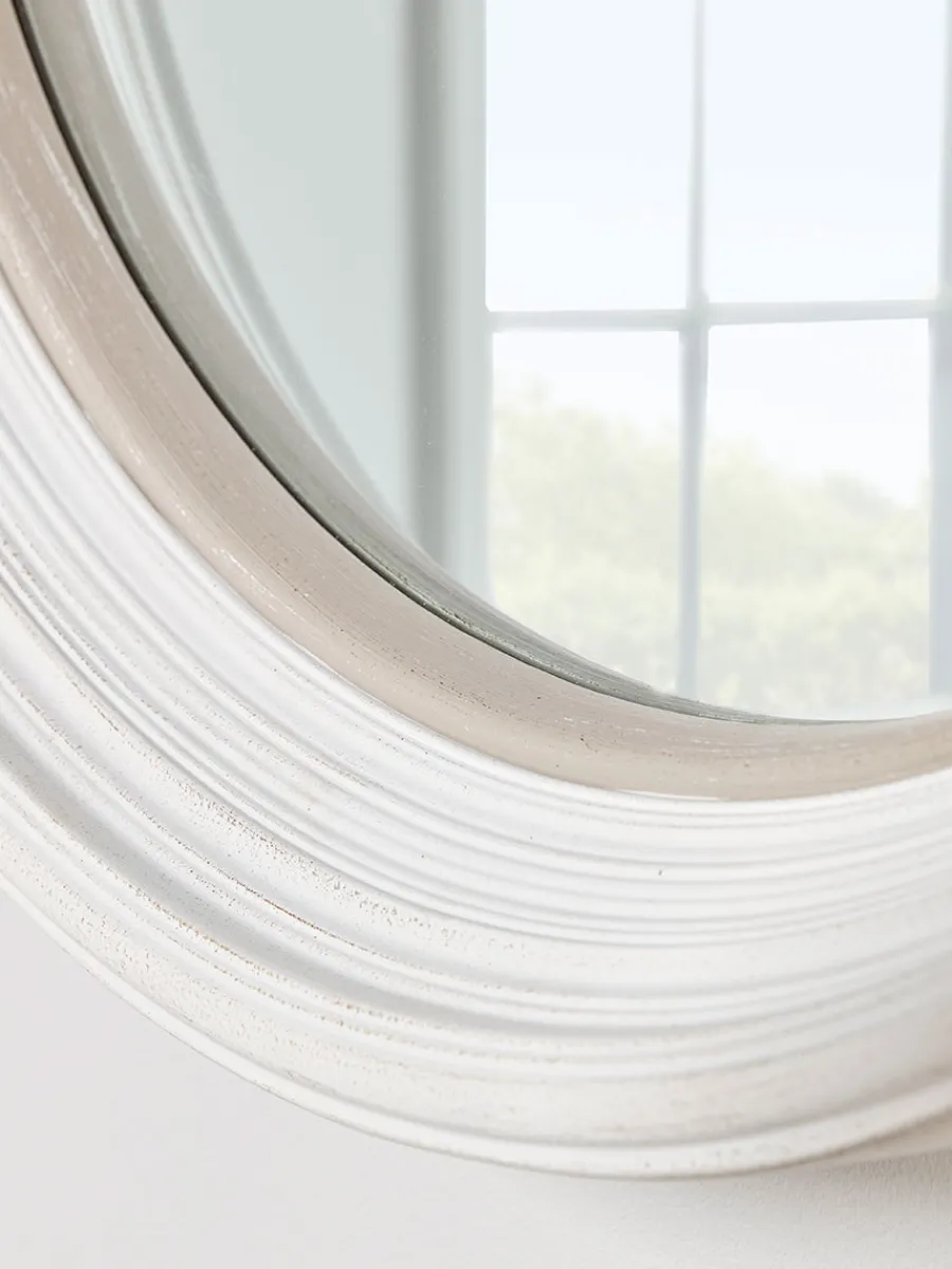 A simple but charming addition to a neutral toned scheme, this round mirror features a wide wooden frame with a ribbed effect and gentle white painted finish.