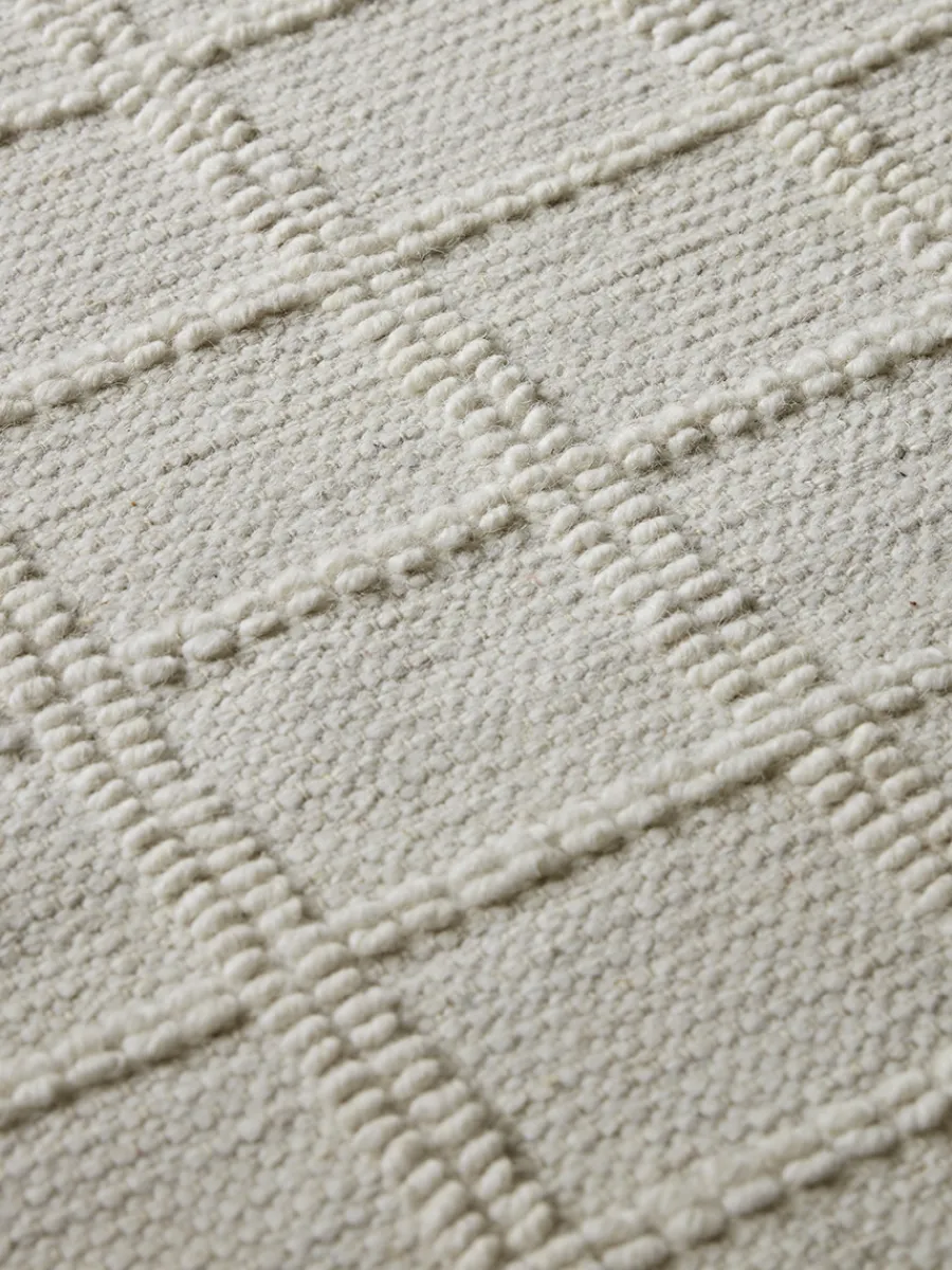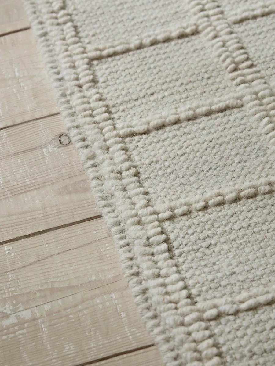Soft oatmeal in tone, the simplicity of our Masai Rug is emboldened by a consistent grid pattern created by lengths of raised stitch which have been worked into the weave.