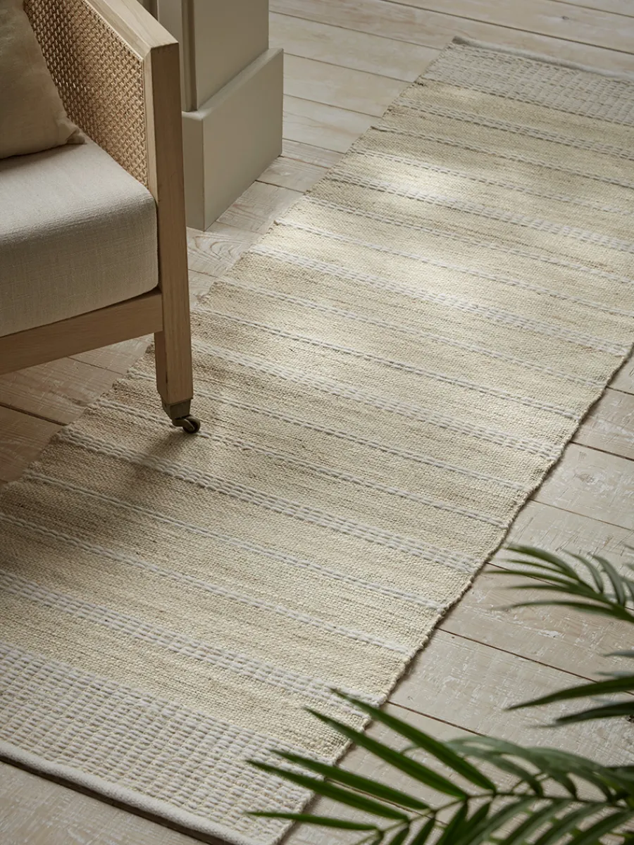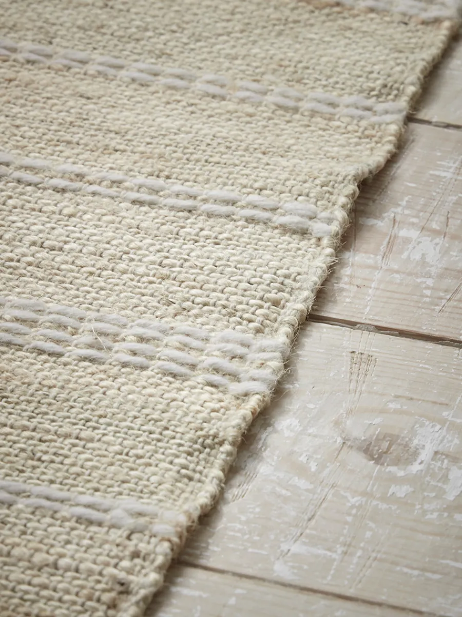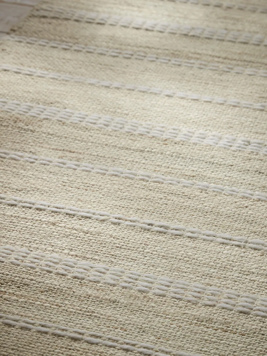 In neutral tones, the delicately woven stripes in white add a further textural depth to the rug, whilst its tufted woolen design creates a warm and comforting feeling underfoot.