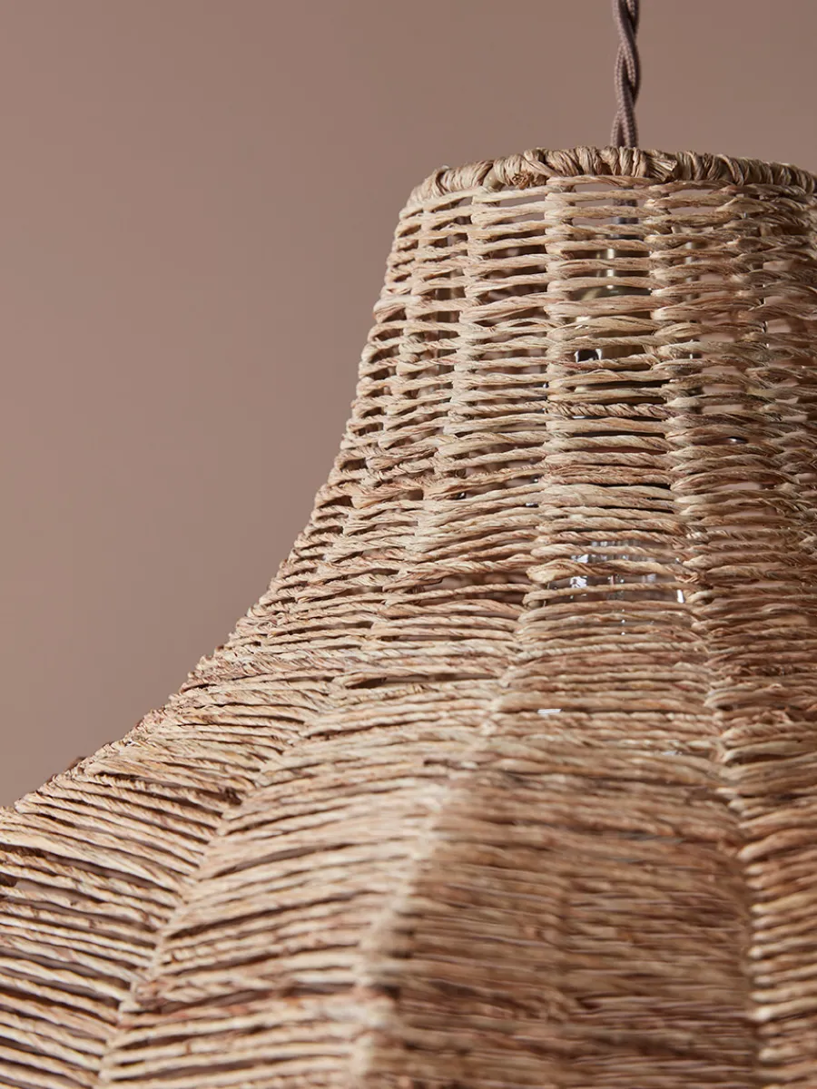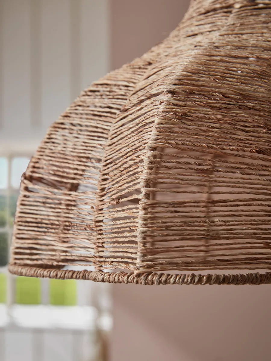 Natural jute weaves in and out of an iron frame, creating a tapered pendant with angular edges in a star-like shape.