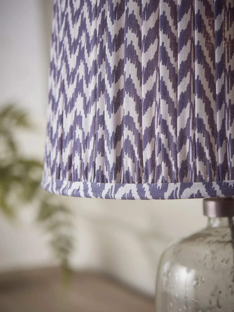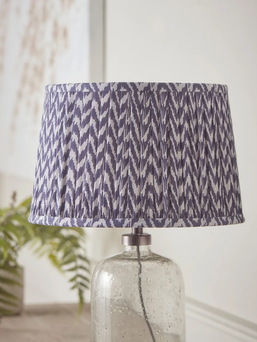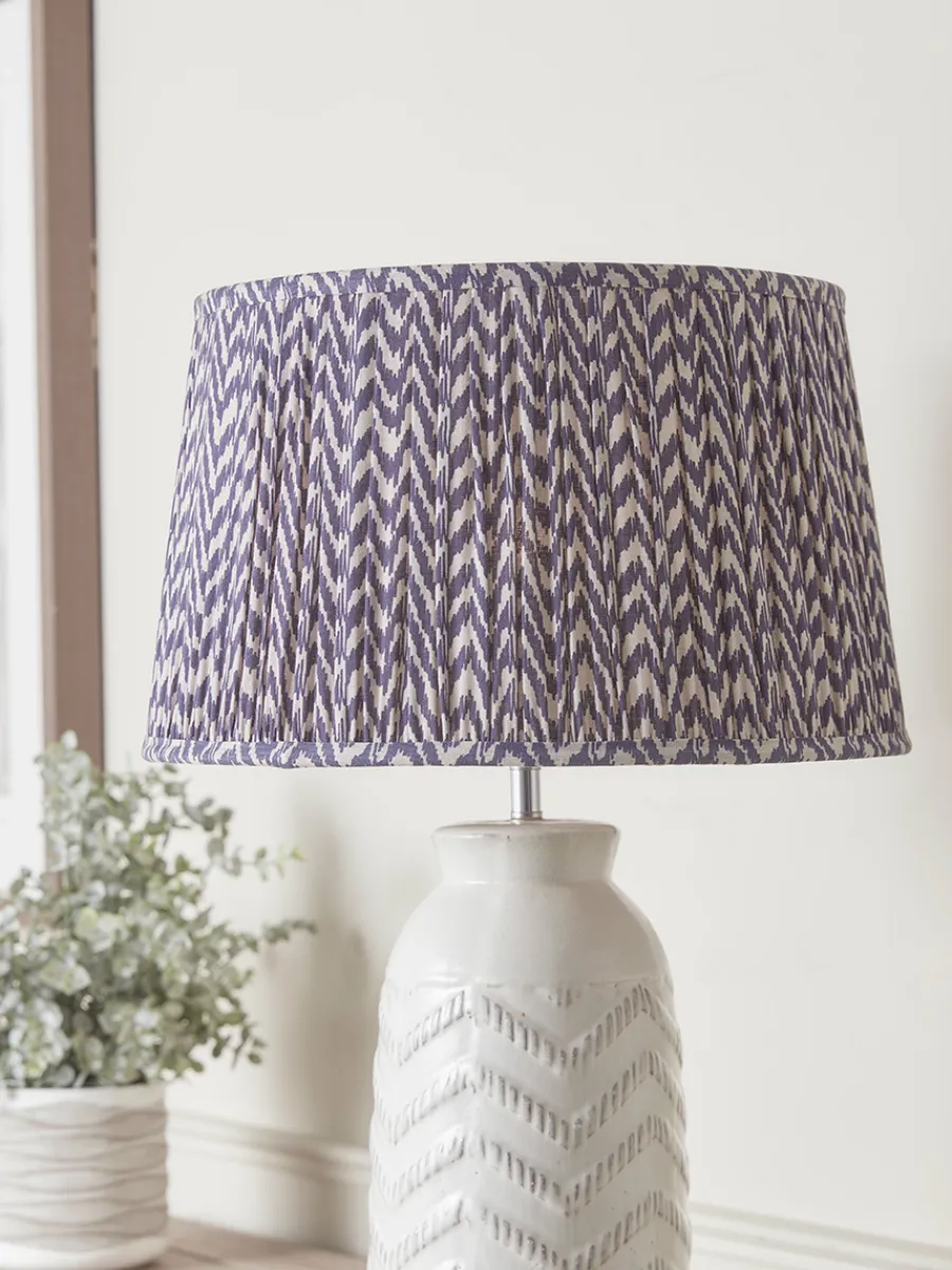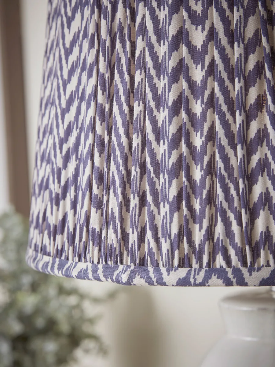 Available in two sizes, this lampshade has a striking blue and white ikat style chevron pattern in blue and white formed into crisp pleats to create a luxurious shade which will bring a fresh look to any of our lamp bases.