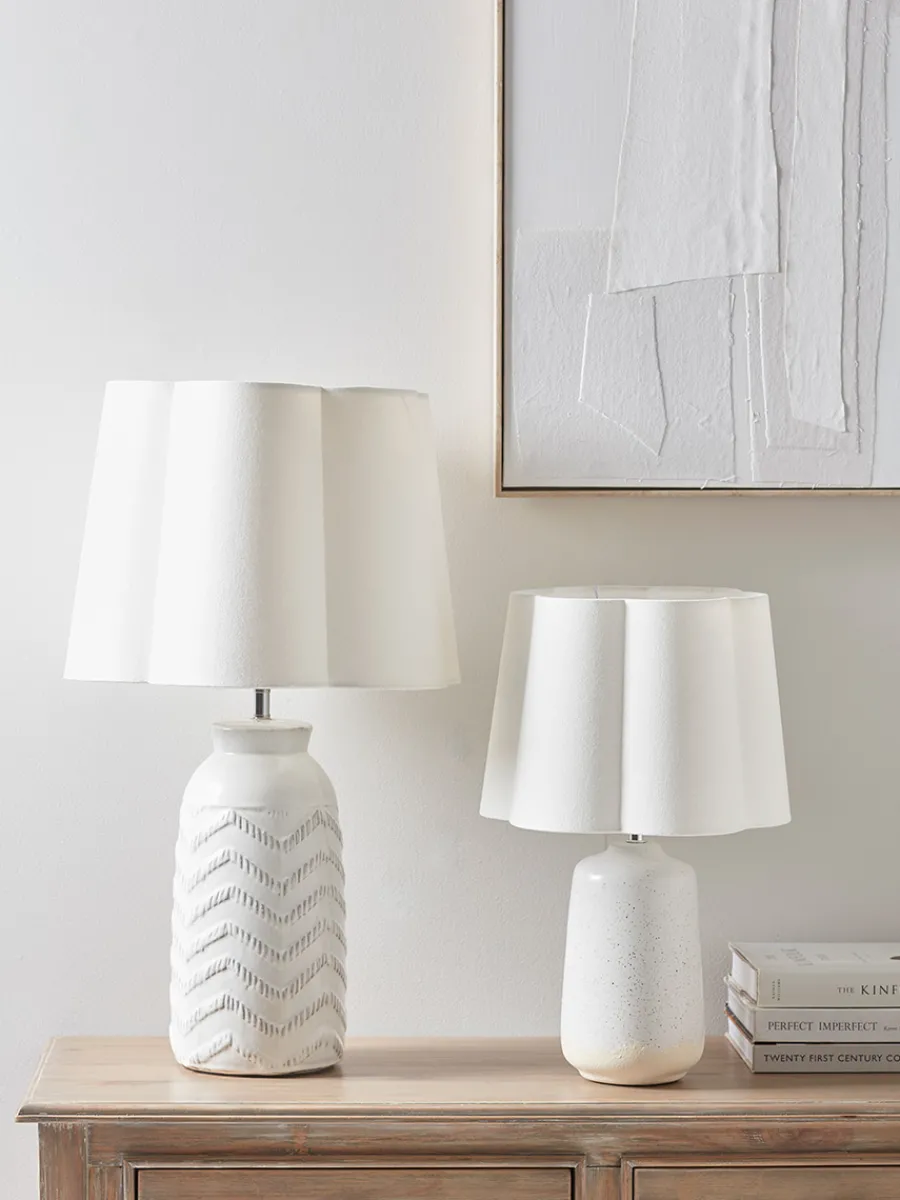 With their undulating scalloped shape and soft cream colouring, these gently tapering shades have a charming cloud-like appeal. Perfect with a neutral-toned lamp base for elevating any interior scheme.