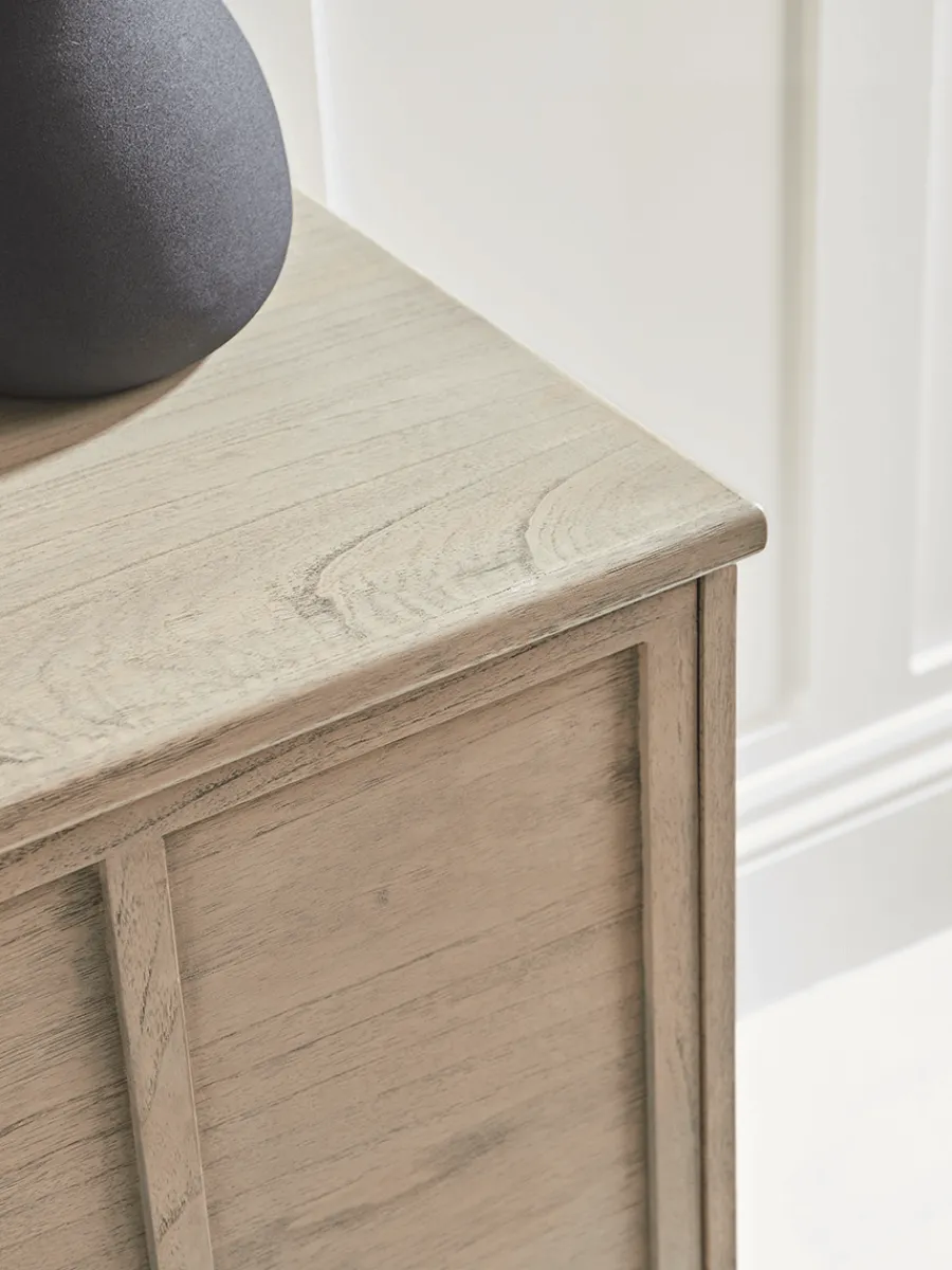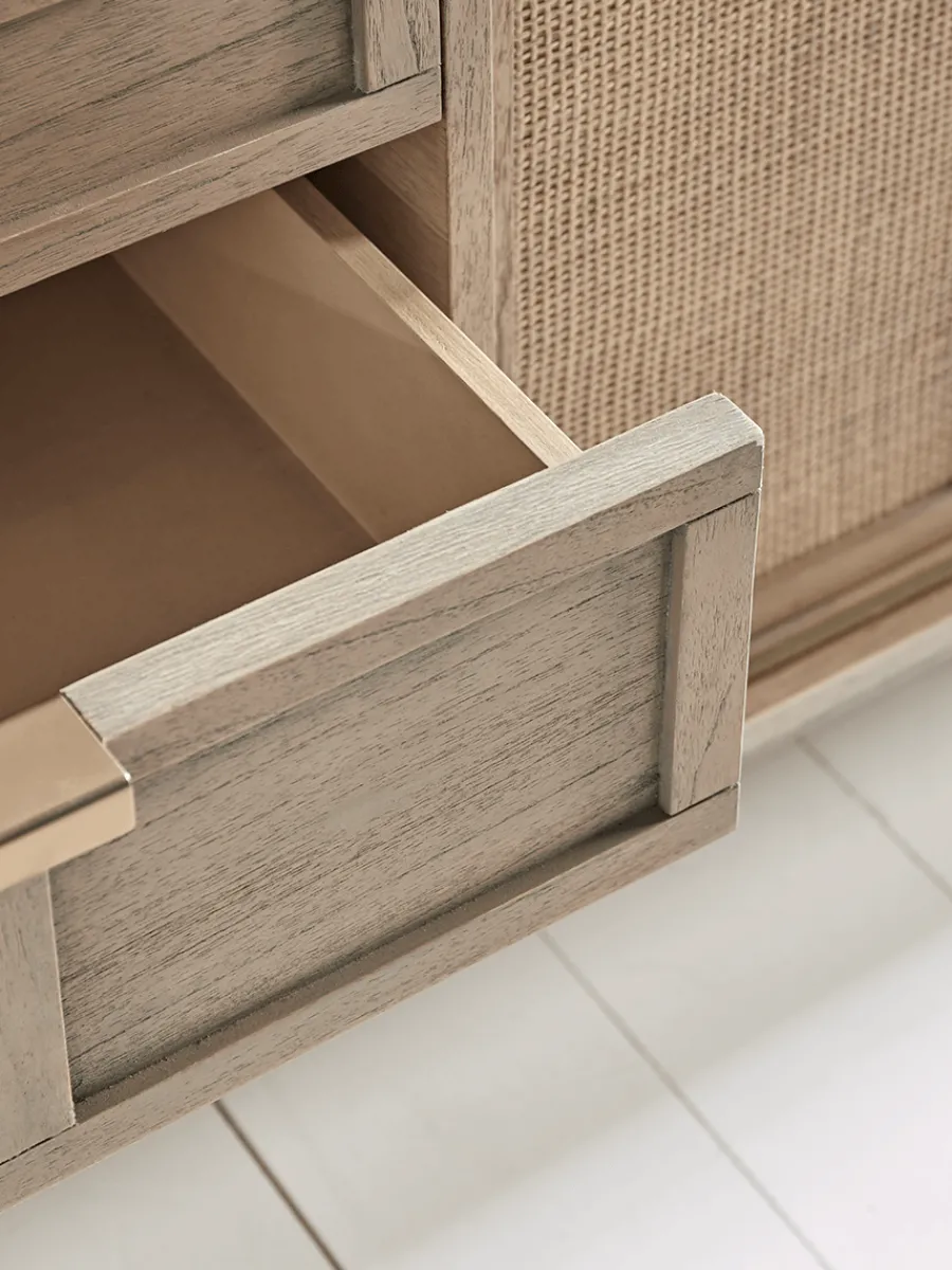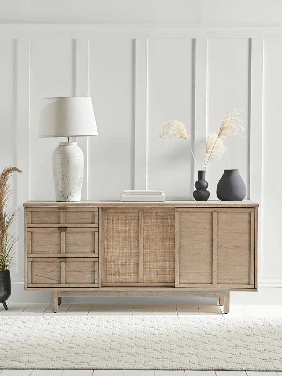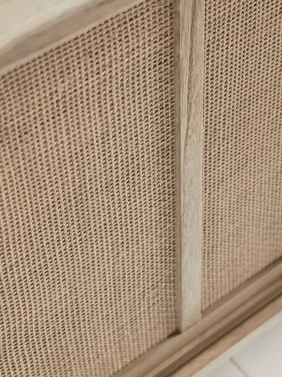 Achieve a clean, minimalist aesthetic in your living space with our Boren Sideboard. Crafted using beautiful Mindi wood with a slightly weathered finish and handwoven rattan cane webbing for a serene, natural touch, this unit has plenty of space on its smooth surface for your favourite ornaments and table lamps.