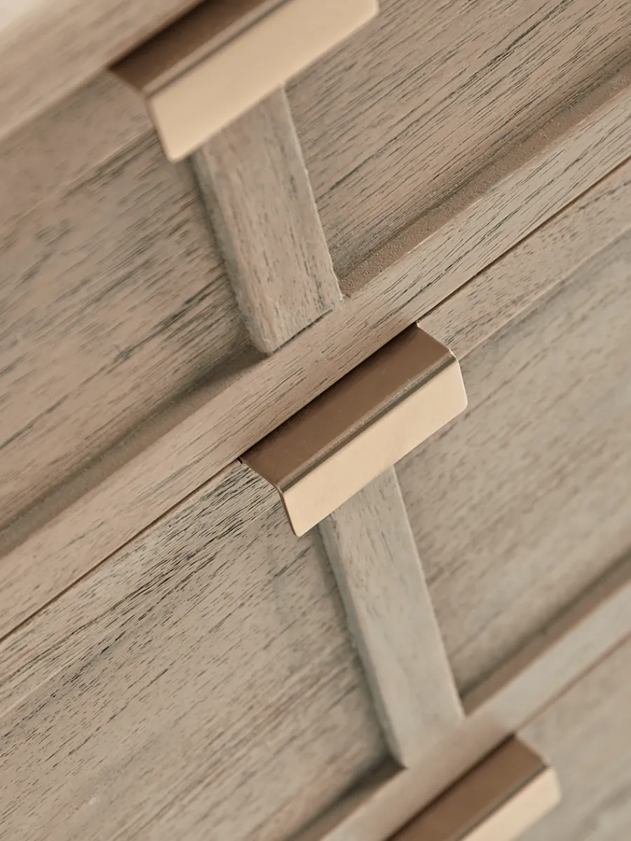 Made from solid Mindi wood, particle board, MDF, plywood, rattan cane webbing with brushed bronze handles.