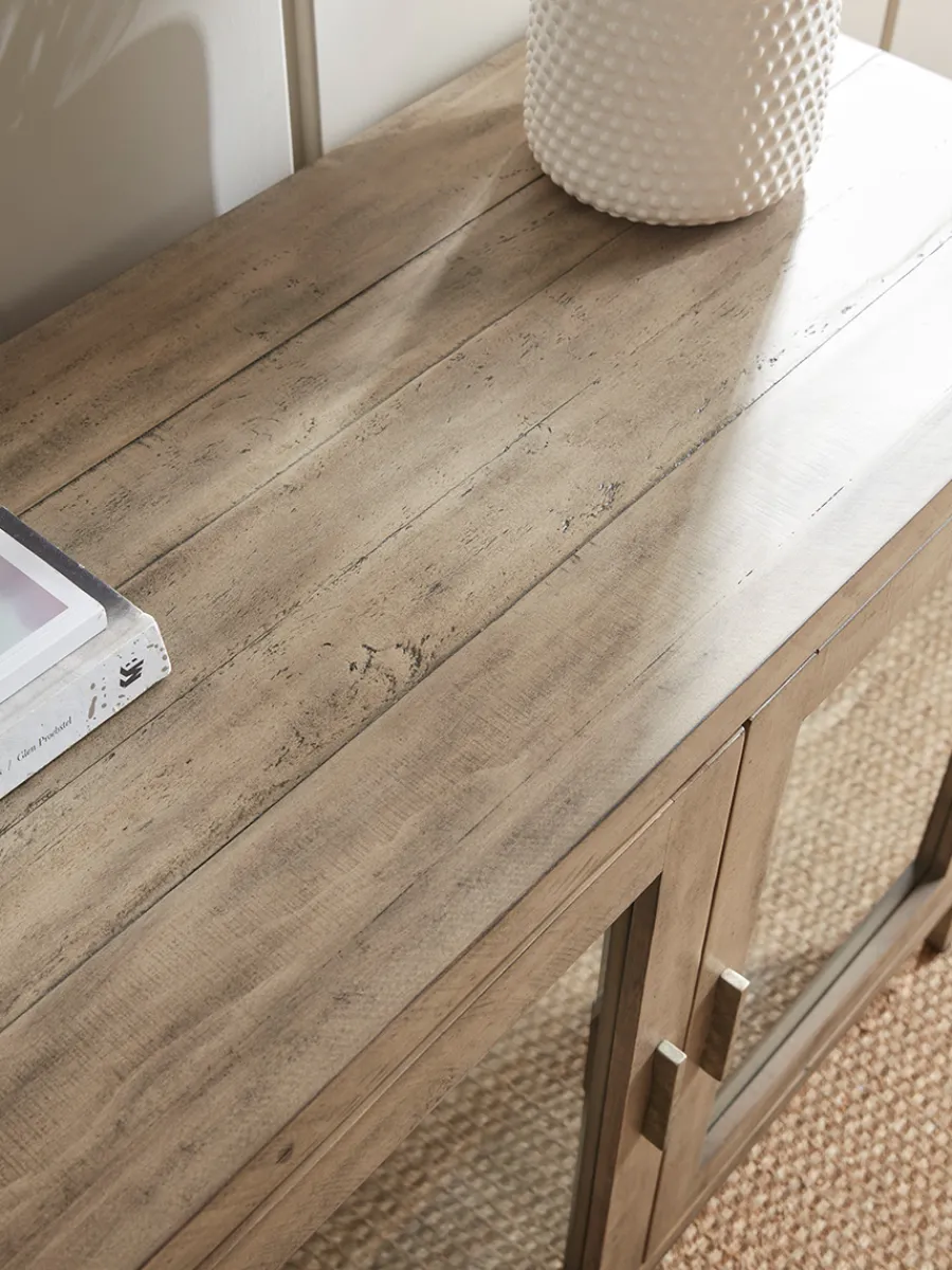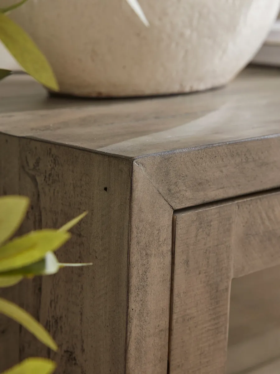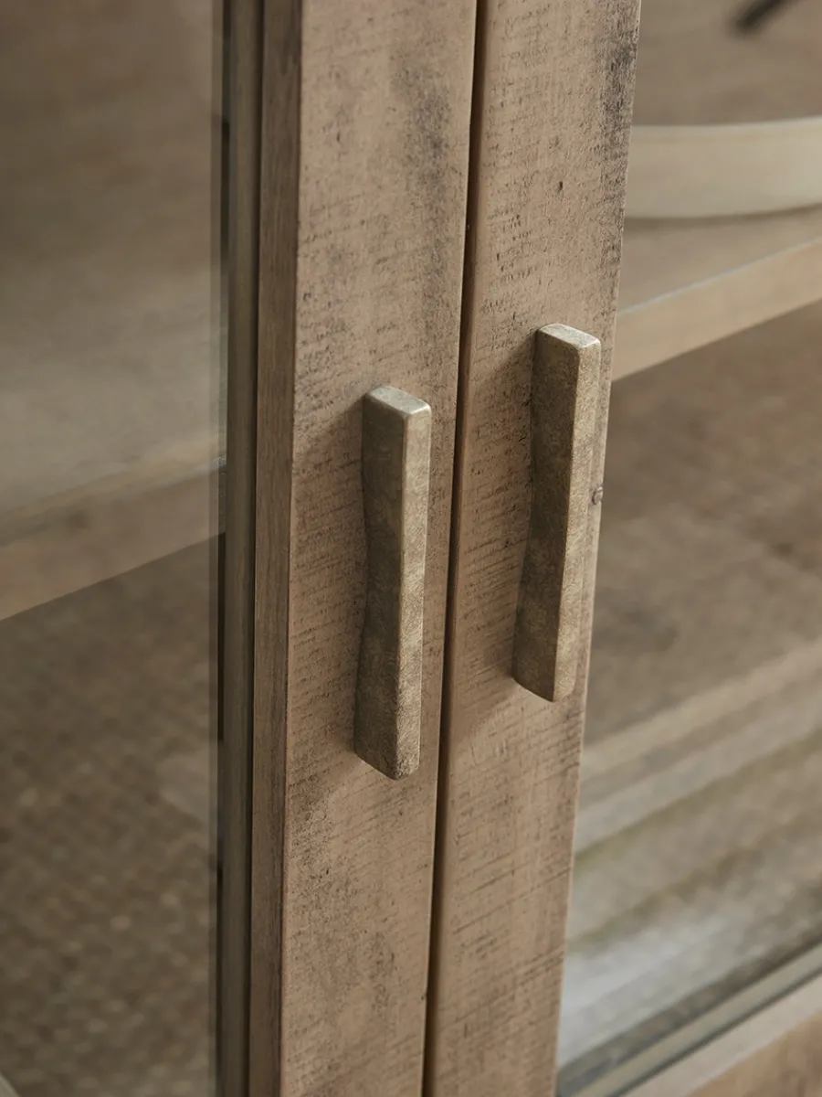 Crafted from pine, our Harlow sideboard has a distressed rustic feel to it. With a blocky structure, the glass doors create a softness to the piece. The brass colour handles paired with this allow for a unified, laid-back style.
