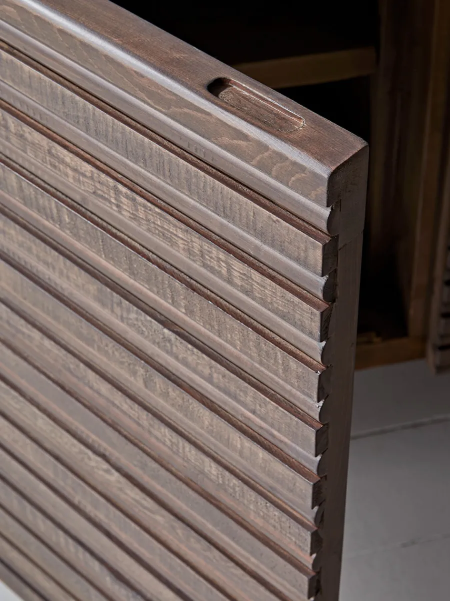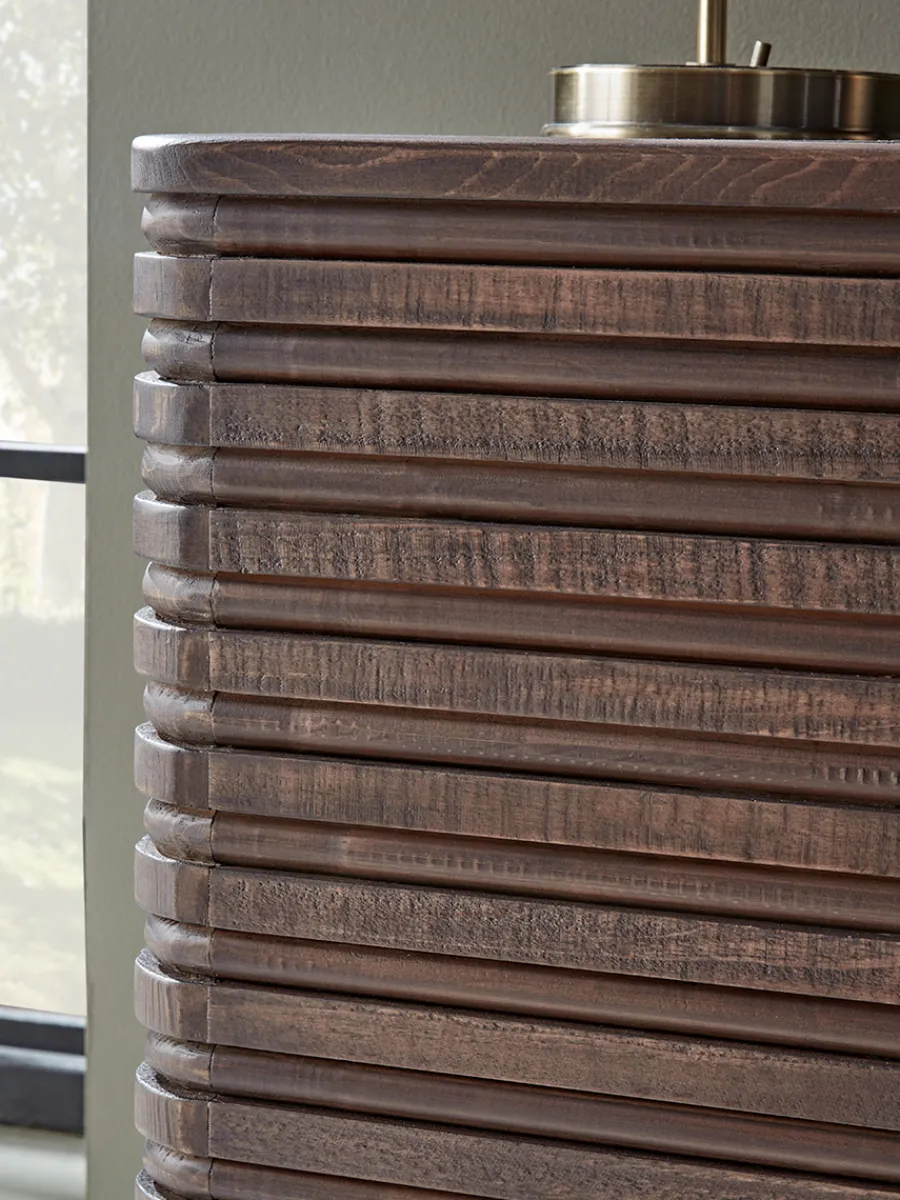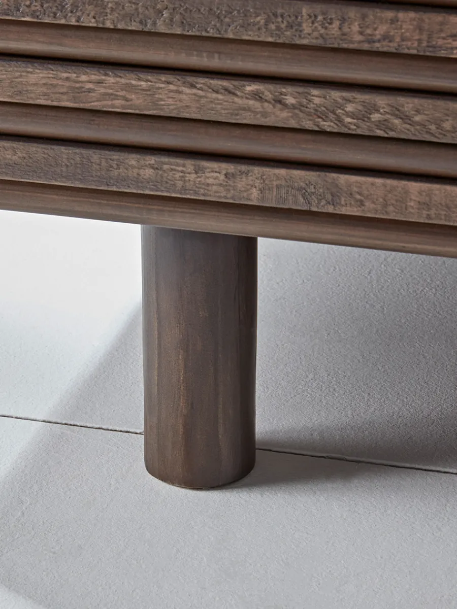 A contemporary horizontal reeded pattern presents a textural striped effect across the main body of the sideboard and rounded edges and cylindrical legs in the same reclaimed wood made for an open and welcoming silhouette.