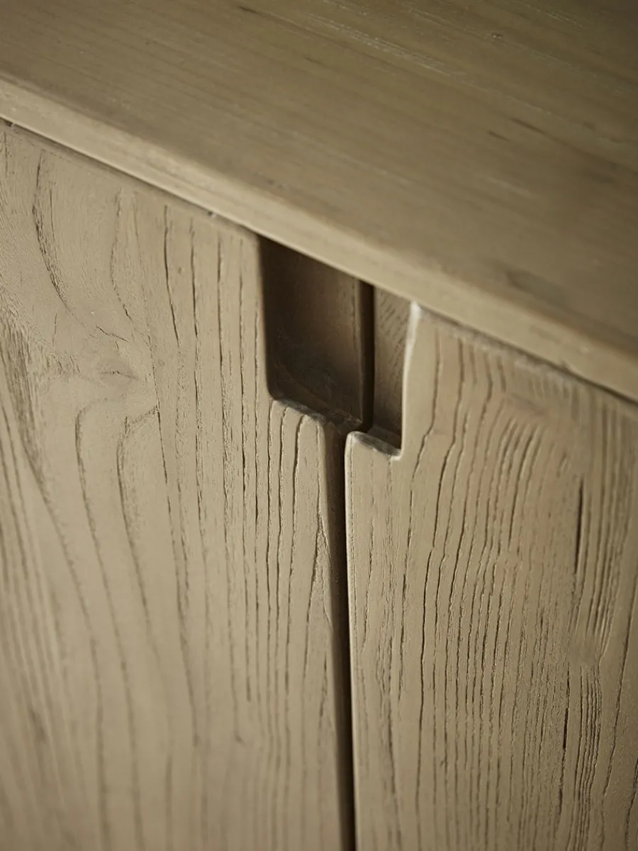 Two cupboard doors have carved handles with soft edges that give a retro feel to this piece, which is further enhanced by the tall and narrow round legs.