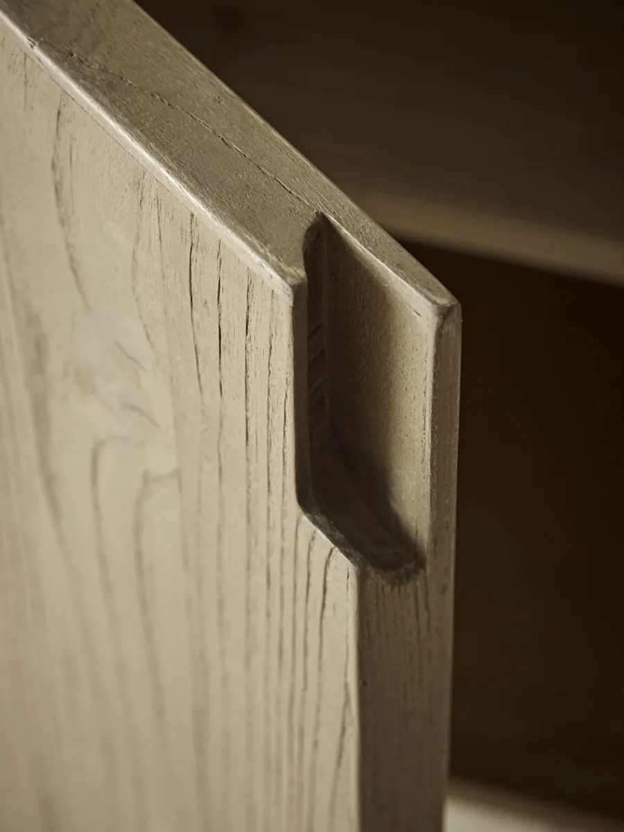 A slightly overhanging tabletop with a carved detailing adds a sweet little finishing touch to an otherwise simple sideboard, perfect for a home that embraces a modern and industrial style.
