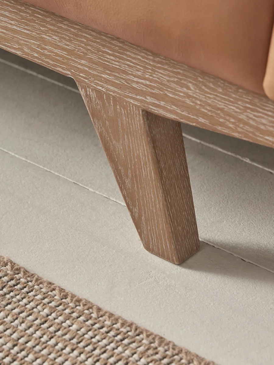 Tan leather sofa with ash wood legs.