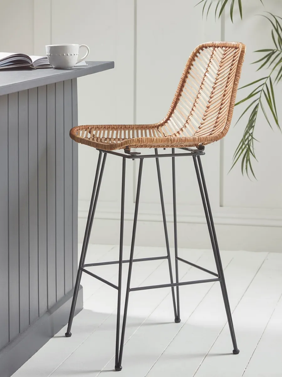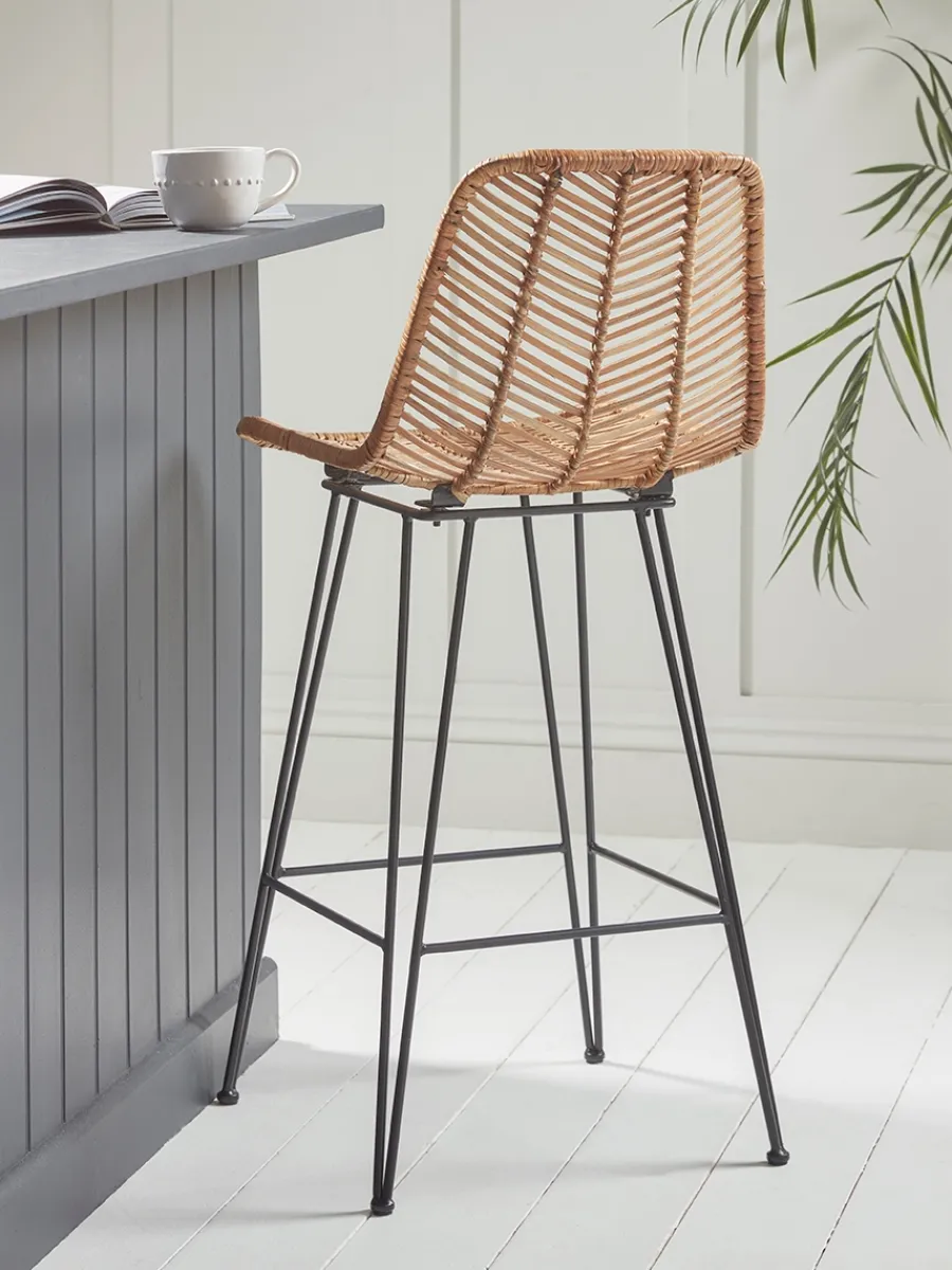 Counter stool with woven rattan seat and black metal legs.