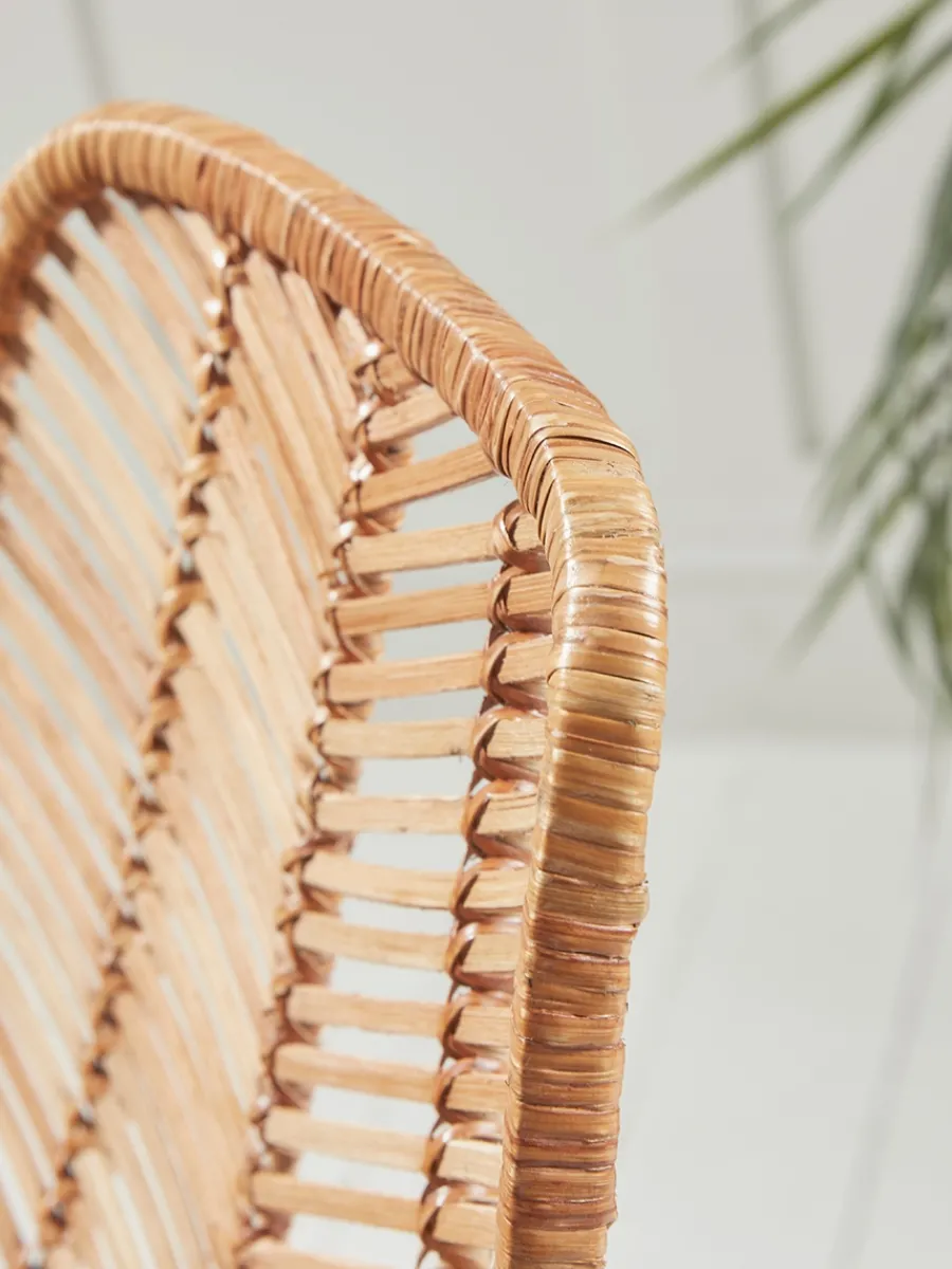 The warm toned wicker seat has a medium height back for comfort and elegant hair pin style slim black metal legs.