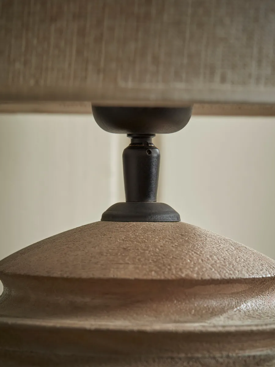 With a warm terracotta toned base, the sphere shape has carved ridges that add depth and dimension to the lamp and bring welcome texture to your space.