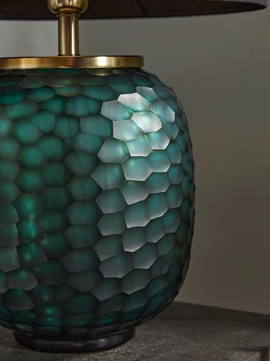 Enrich your home with the warming glow of our green cut glass table lamp.