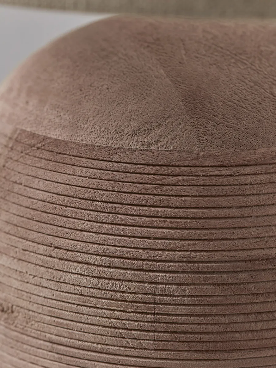 Brimming with natural texture, this table lamp has a dome shaped base with a carved ribbed design running around it. Made from richly toned mango wood, the base is paired with a natural linen shade in a complementary neutral.