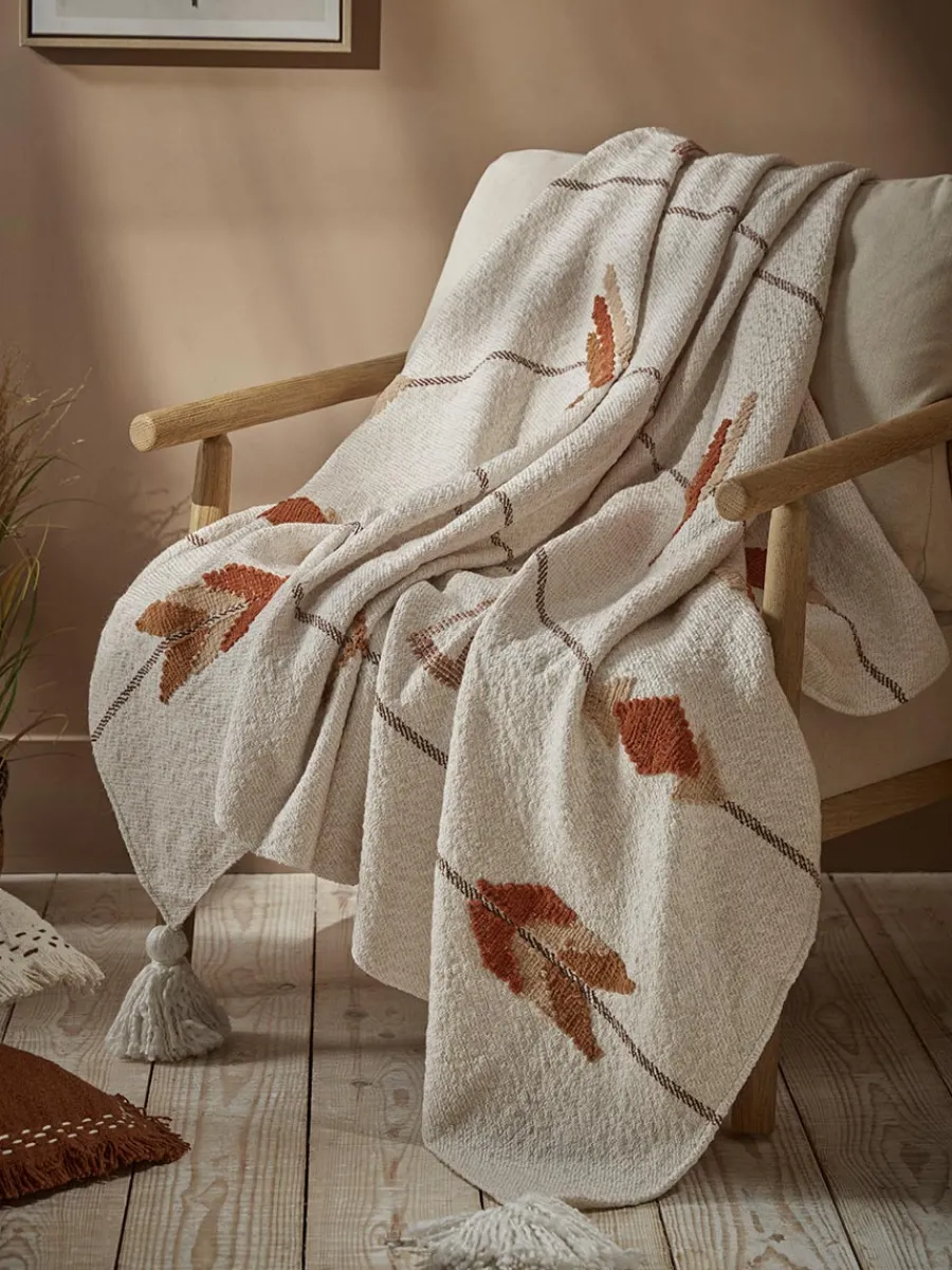 Our Rousillon throw features an unusual arrow design in a trio of warm spice tones embroidered on a neutral background.