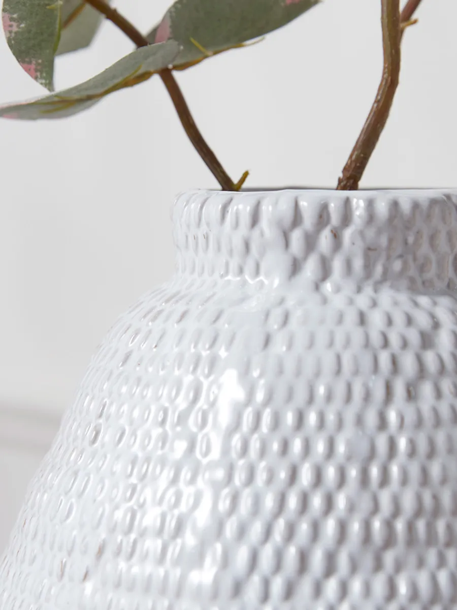Covered in a multitude of delightful dimples which scatter the light, our Ebbie Vase features an organic silhouette, with a wide body narrowing to a neat raised mouth. Perfect for supporting longer stems, this large vase will elevate any console table or shelf.