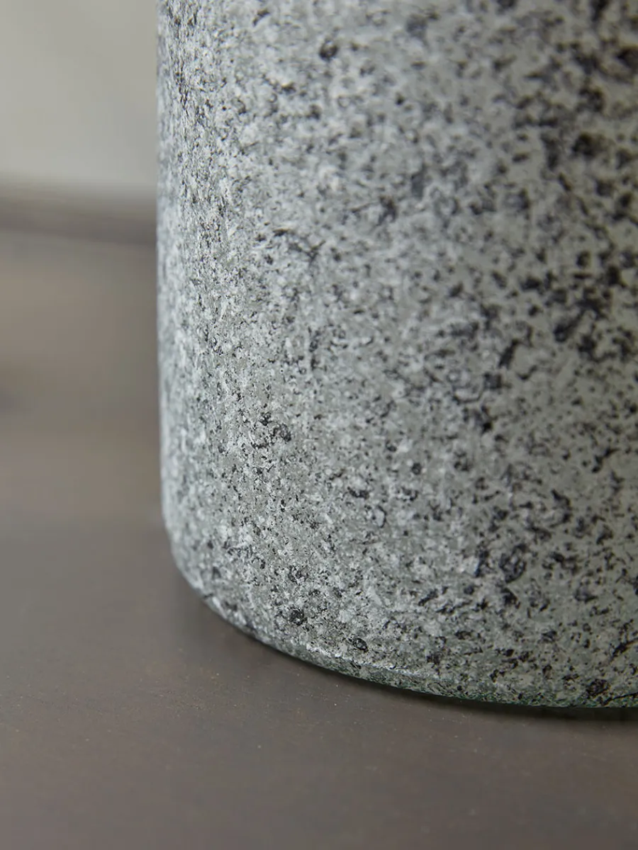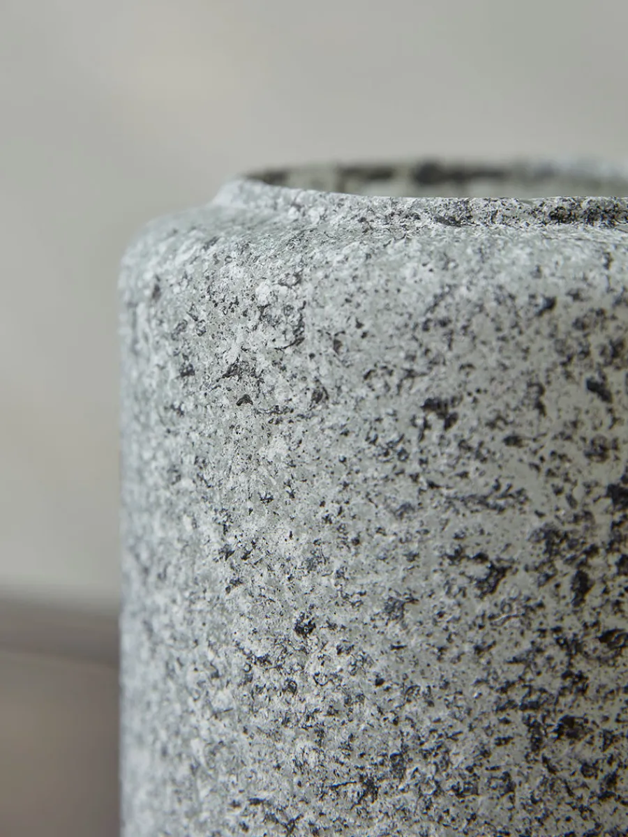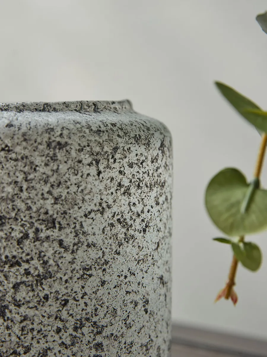 On a dark green-grey base, the white and black speckling stands out to create a vase that not only looks beautiful with a full bouquet in it, but sits gracefully as a modern stand alone piece.