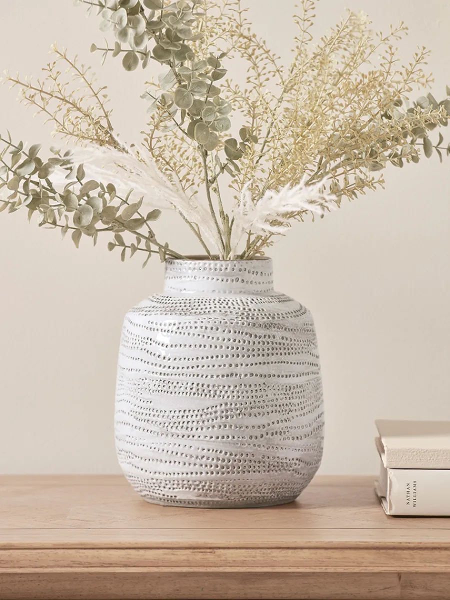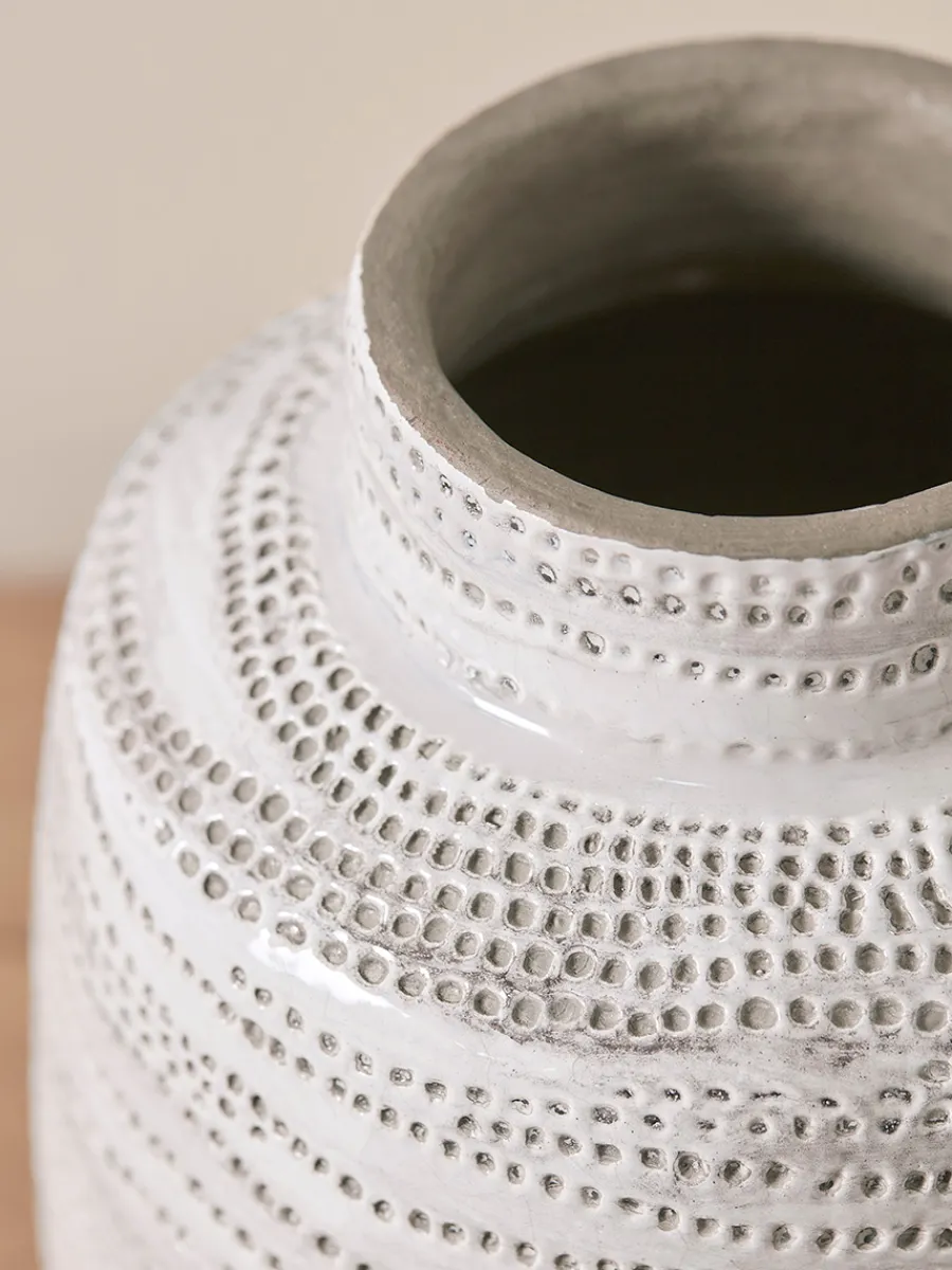 The bold outline of this pleasingly rotund vase will translate into any interior thanks to its neutral palette and the simple, yet charming, indented dot pattern which snakes around its body.